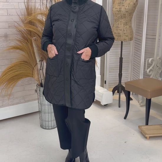 Stay effortlessly chic and cozy with the Charlie B Iridescent Long Reversible Quilted Puffer. This versatile long jacket features a sophisticated quilted design that delivers exceptional comfort and a touch of iridescent shine. It includes a snap button front, a stylish contrasting leather-look placket, and convenient side zippers. With its reversible design, you get two distinctive looks in one, seamlessly blending practicality with modern flair.