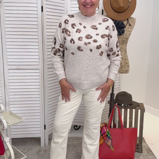 Stay stylish and cozy with the Charlie B Mock Neck Sweater, featuring eye-catching animal print sequin details. Perfect for adding a playful touch to your wardrobe while keeping warm.