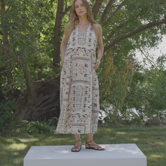 A scarf print brings vibrant character to this linen blend dress, cut in a fluid A-line silhouette. Designed with a sleeveless shape, V-neckline, and side pockets, it offers effortless ease and polish in a midi length. (Copyright Joseph Ribkoff 2026)