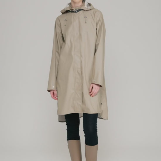 A feminine A-shaped under knee raincoat in a loose fit. The raincoat has a discreet Ilse Jacobsen Hornbæk logo debossed on left sleeve. The hood is detachable and is attached by a weather proof strap in artificial leather. The style features side pockets with flaps, fancy slits in side seams with press buttons, button closure at wrist and a YKK 2-way zipper at center front. Inside the style has a clean and delicate finish with logo ribbon. Quality is a light and subtle waterproof rubberized PU with polyester tricot on backside and all seams are double welded. (Copyright Ilse Jacobsen 2024)