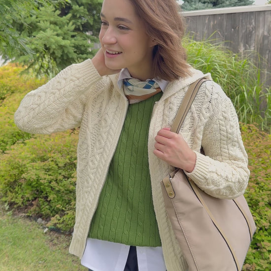 As part of our Heirlooms Collection, this zipped hoodie jacket is the perfect outerwear piece to wear on cooler days. The hood, pockets and sporty shape are perfect for cosying into from the cold while the traditional Aran stitch pattern evokes our heritage.