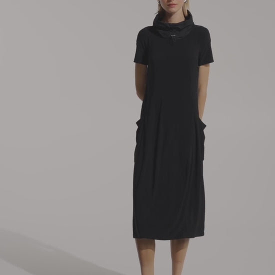 A sporty twist on a cocoon classic. This silky knit dress features a structured memory funnel collar with drawstring detail, balanced by soft gathers and a relaxed fit that falls just below the knee. (Copyright Joseph Ribkoff 2025)