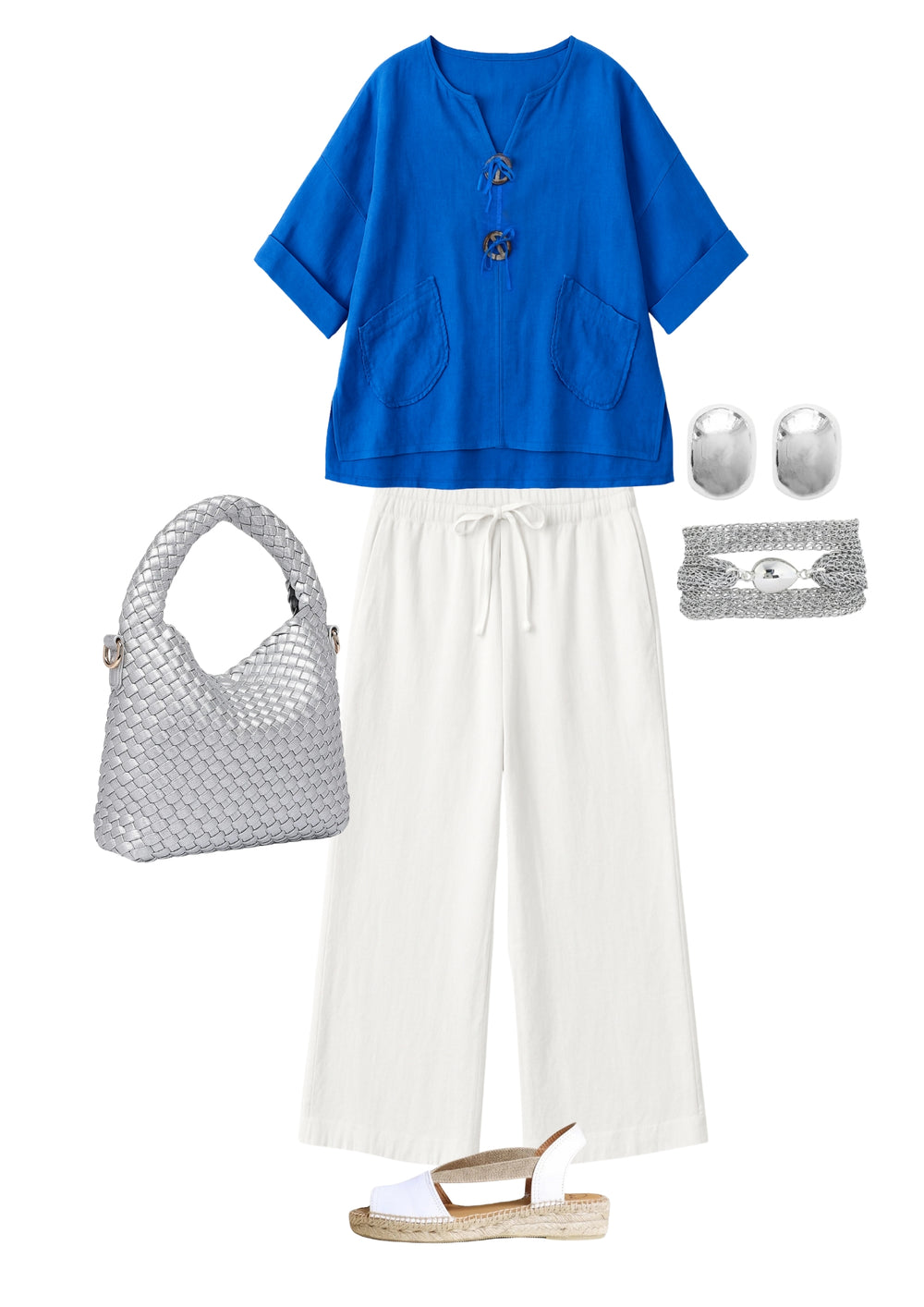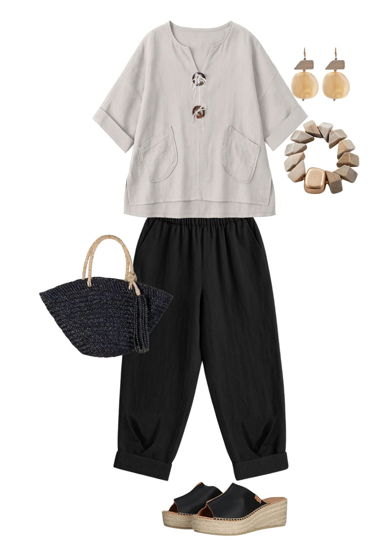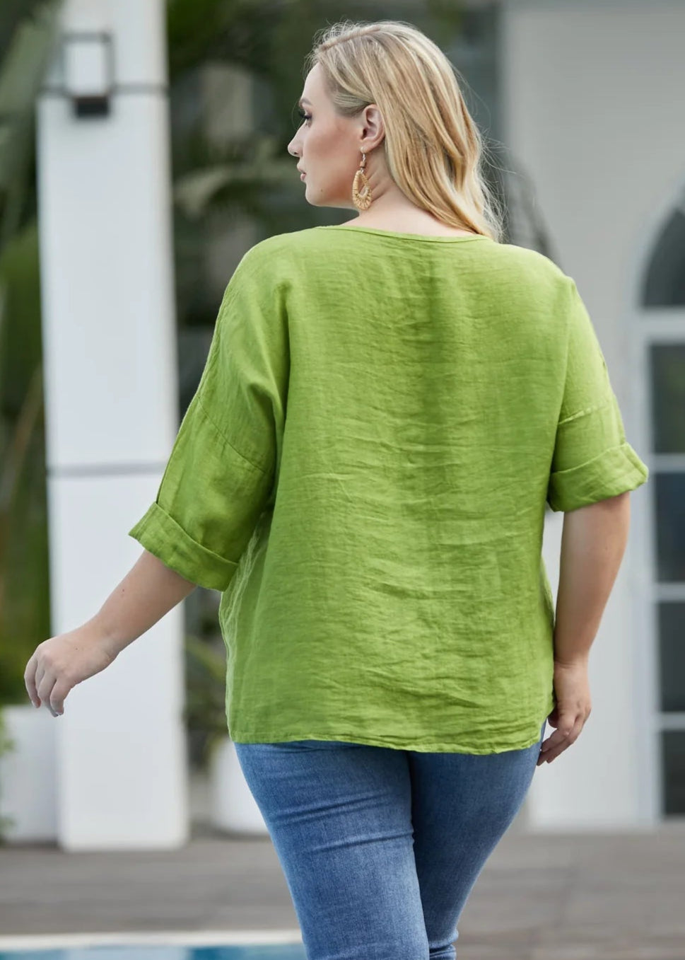 This linen top from Italy features a unique coconut button detail and convenient front patch pockets. Enhance your style and stay functional with this quality piece! (Copyright Orange Fashion Village 2025)