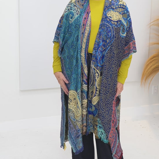 Rapti is a beautifully embroidered long ruana that will take your breath away. Made with vibrant, saturated colors, it's sure to turn heads. A must-have for anyone who wants to make a statement.
