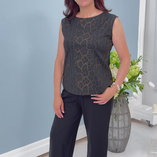 Meet the Ponte Rosa Luxe Animal Print Shell by Shepherd’s—a bra-friendly, sleeveless top that perfectly blends relaxed comfort with a tailored fit. Its sleek silhouette offers effortless style whether worn alone or layered under jackets and cardigans. With its chic animal print and versatile design, this shell is your go-to for polished everyday looks or comfortable lounging in luxe fashion.