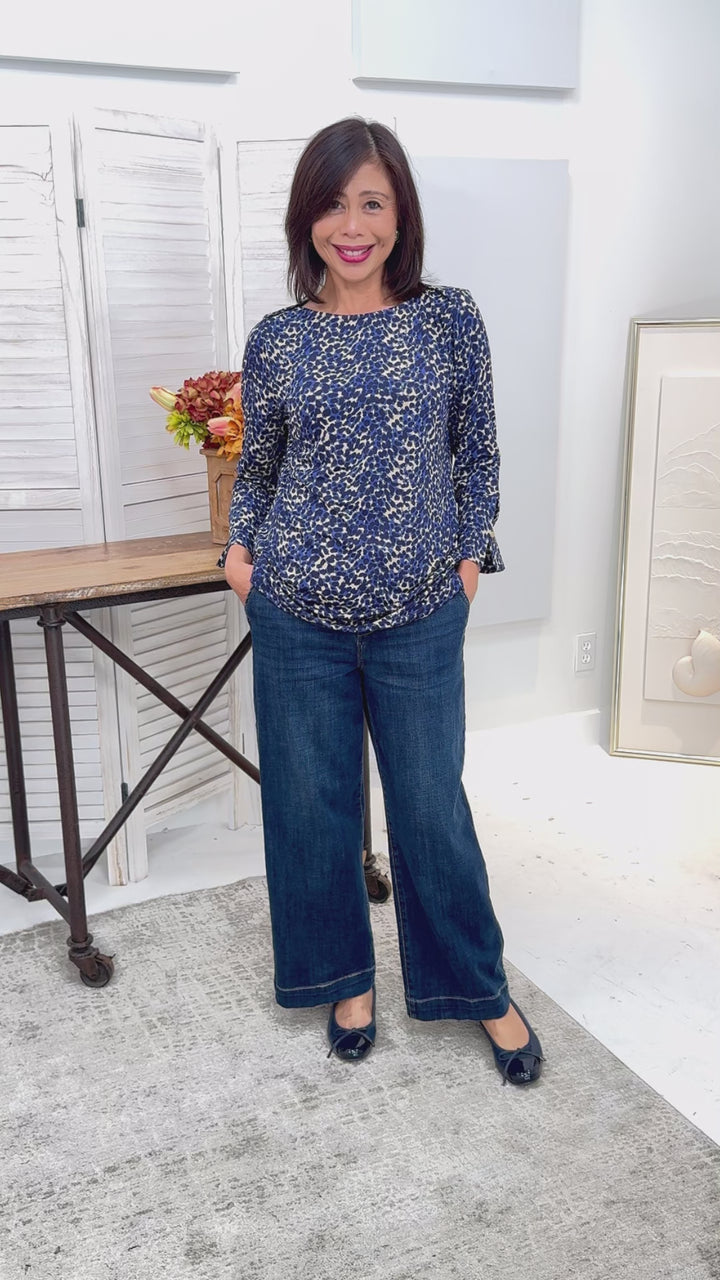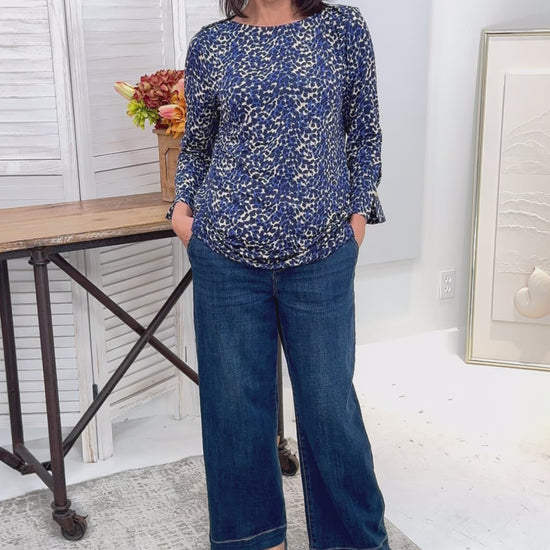 The Yest Bryn Top combines a soft fabric with a boat neck and 3/4 sleeves, featuring a stylish printed design for comfortable, everyday elegance.
