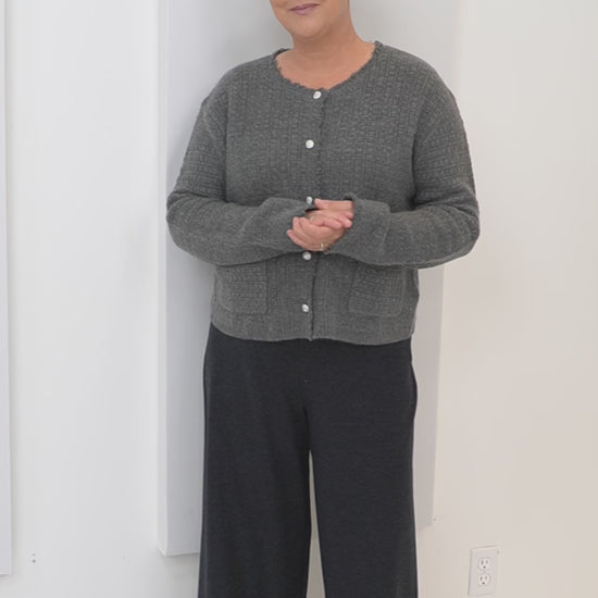 This wool-cashmere knit cardigan features a sophisticated full button-front closure with crystal buttons, offering both elegance and function. Designed with two practical patch pockets, it seamlessly blends timeless style with everyday utility. Perfect for layering, it provides warmth and comfort while elevating your wardrobe with refined detail and expert craftsmanship.