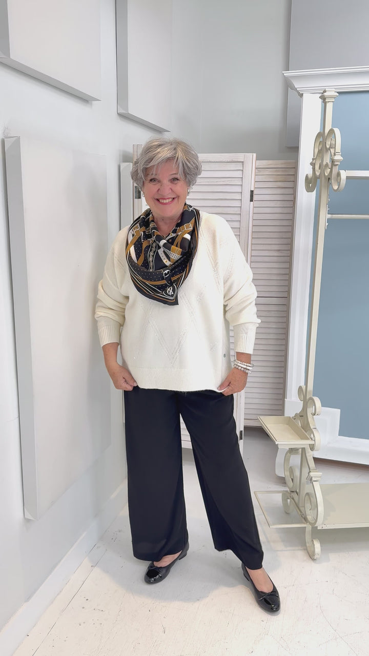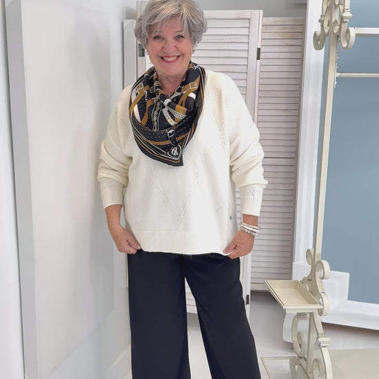 Adorned with a stylish clear sequin design on the front and sleeves, this unique sweater knit pullover adds a touch of charm to your cool-weather wardrobe. A flattering V-neckline, long straight sleeves, and side slits complete the look with simple yet elegant lines. (Copyright Joseph Ribkoff 2025)