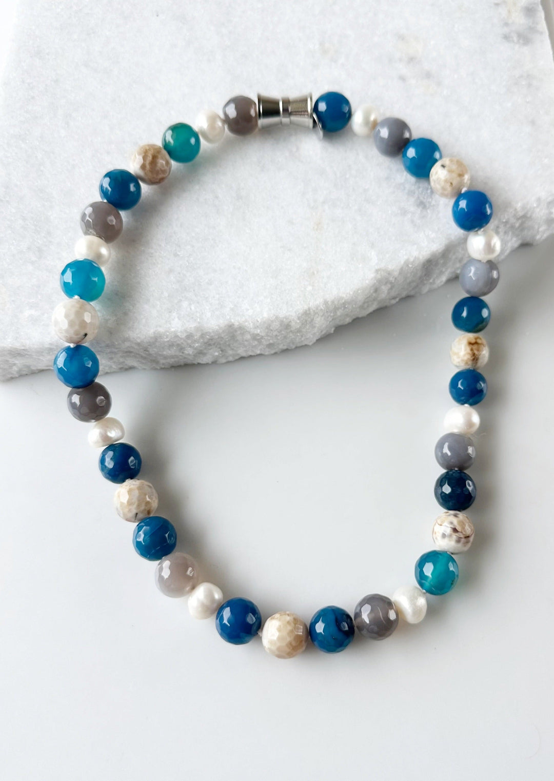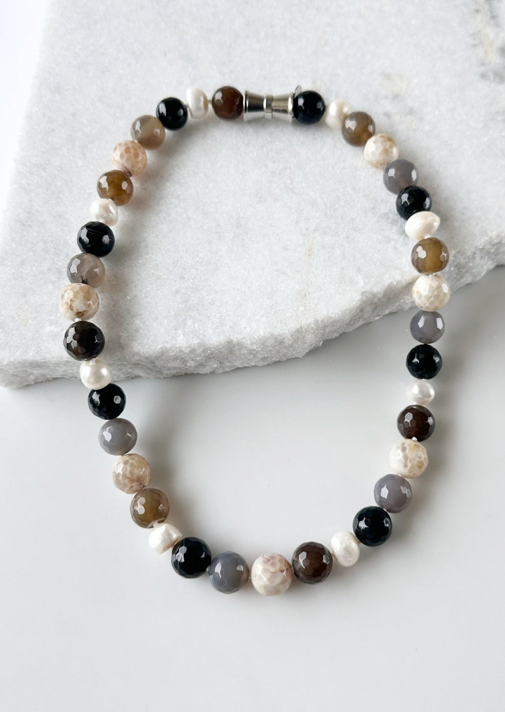Au cours de ses voyages, elle a passé beaucoup de temps en Chine et est tombée amoureuse de la culture, des gens et des belles perles d'eau douce cultivées dans le pays. Les perles ont une belle sensation organique et un lustre qui apporte de la lumière à la peau.