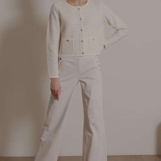 Sequined yarn and gleaming golden buttons give this sweater knit cover-up a dazzling allure. Framed by a classic crew neck and long straight sleeves, it features stylish front pockets adorned with golden buttons, making it a stunning addition to any wardrobe.