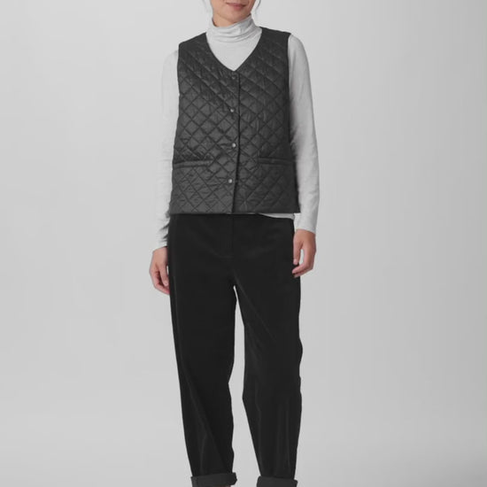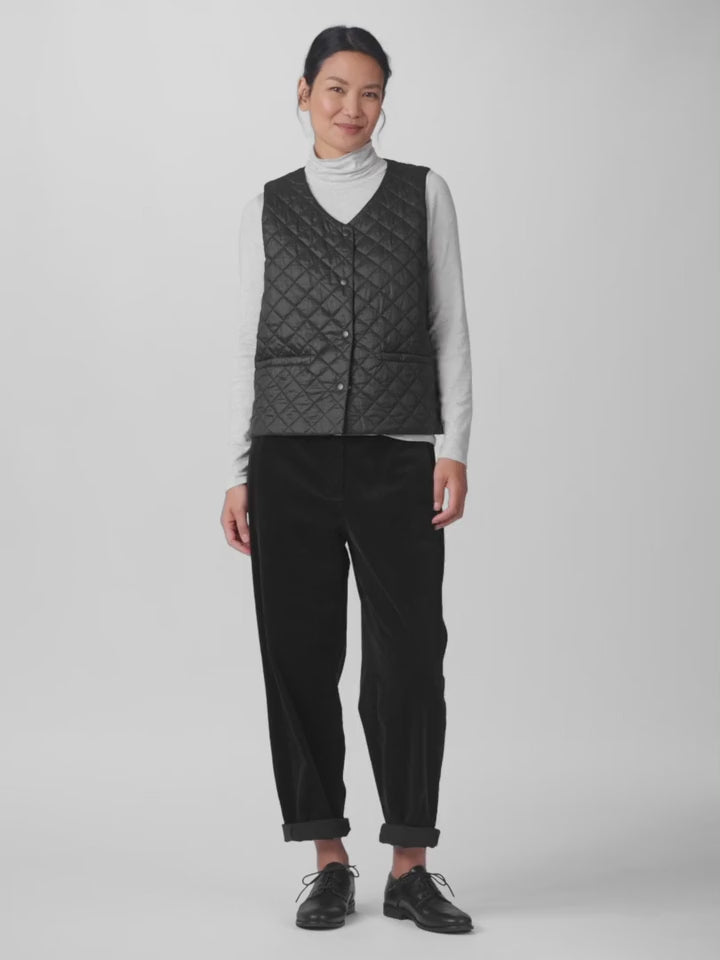 A quilted vest with a V-neck and snap button front. In a recycled nylon weave that keeps warmth in—and waste out of landfills. (Copyright Eileen Fisher 2025)