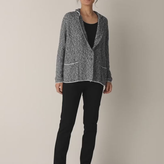The structure of a jacket, the softness of a sweater. An elevated shape with a notch collar and button front, in a dimensional blend of organic cotton and recycled nylon. (Copyright Eileen Fisher 2025)