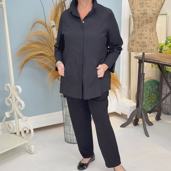Cette chemise boutonnée est propre, nette et prête à être portée. La patte de boutonnage avant a des boutons cachés et les coutures princesse cachent des poches dans les coutures. Les poignets sur les manches ont un slip pour un look élégant supplémentaire. Il s'agit d'une chemise ample avec une forme trapèze. Flatteur pour la plupart des types de corps.