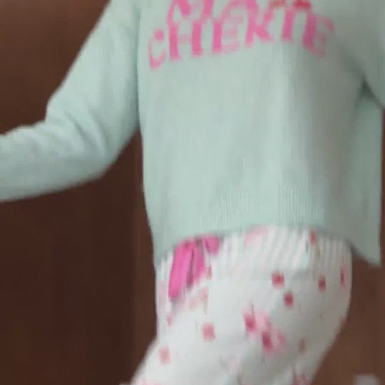 Soft, fuzzy, and made to be lived in—this snuggle sweater brings serious lounge appeal. The minty green knit is plush and stretchy with a relaxed fit, finished with a sweet cherry and pink “ma chérie” graphic. It’s the kind of layer that’s made for slow days and sweet moments at home. (Copyright PJ Salvage 2025)