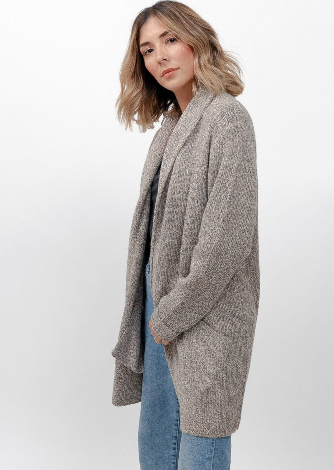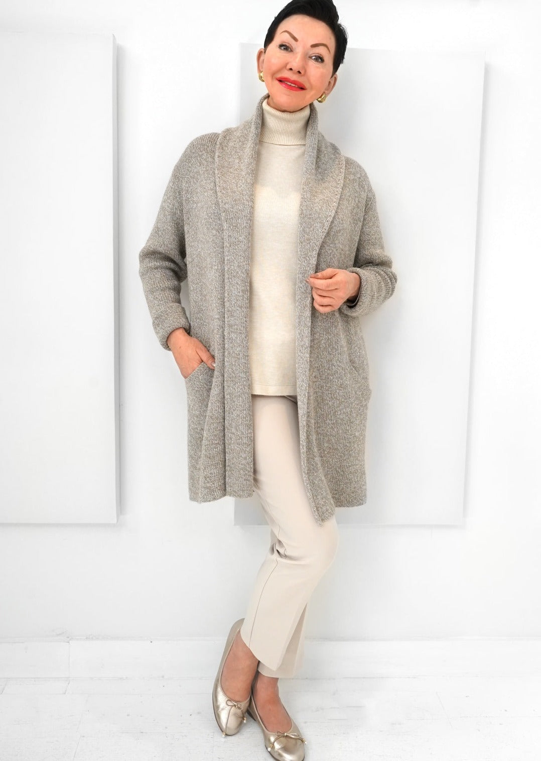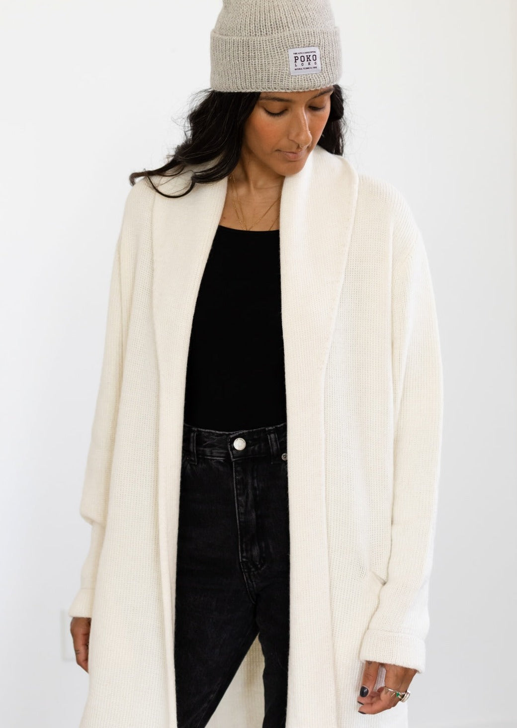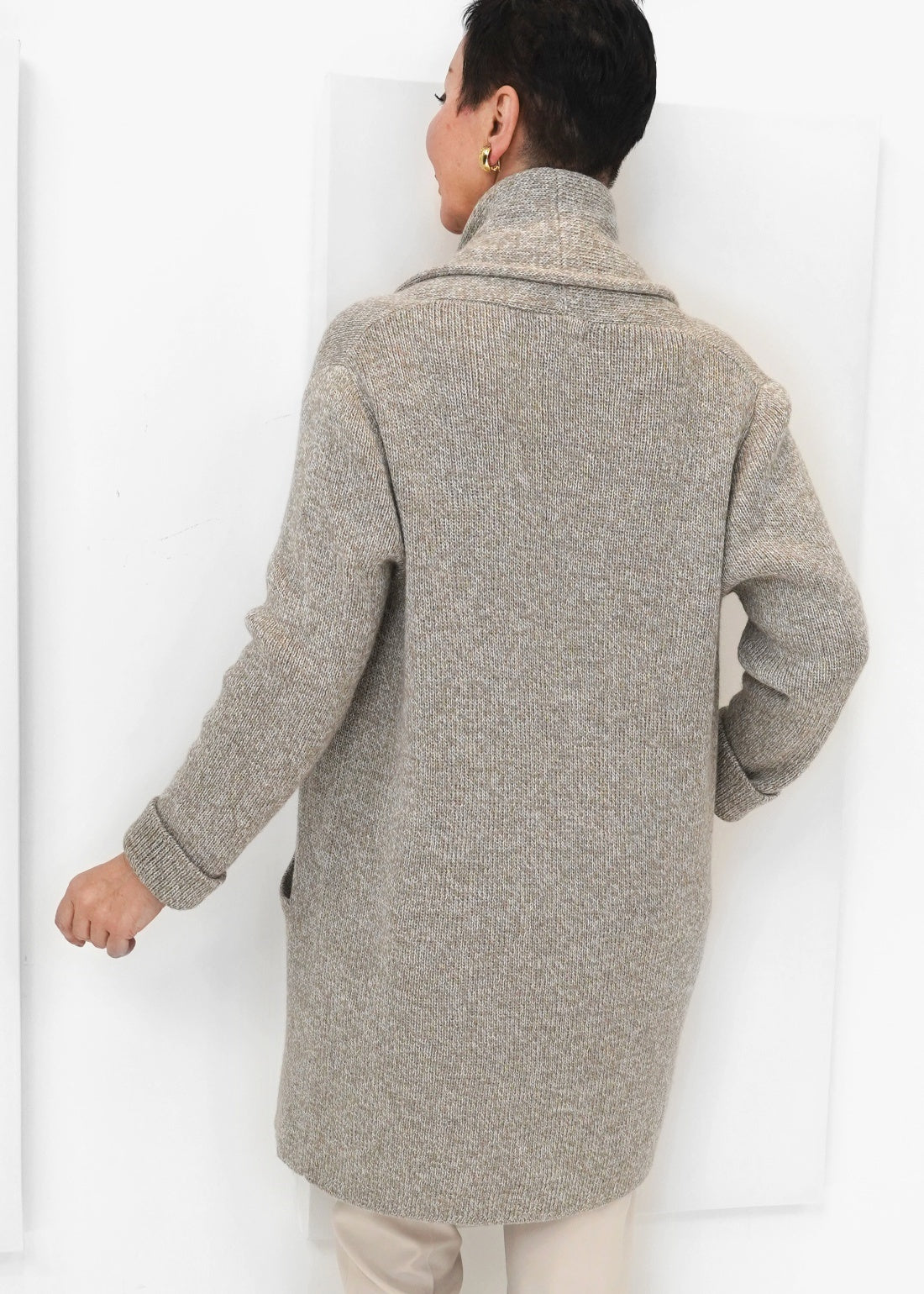 With deep open pockets and rounded shoulders, the Mia Sweater has a versatile style infused with the Peruvian textile artistry. Alpaca has a stretchy, silky nature to it, so this one-size alpaca style is able to fit many different types of bodies. We’ve gone a medium length, with a complementary backline; this doubles as a Fall, transition coat, and a year-round sweater.