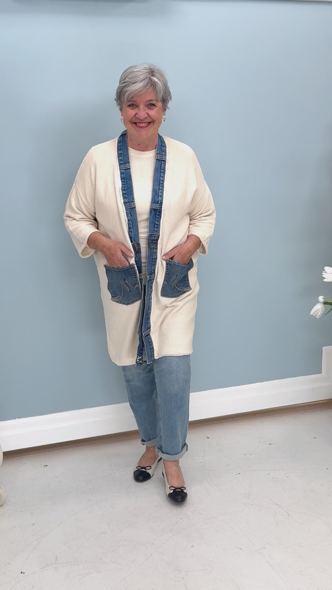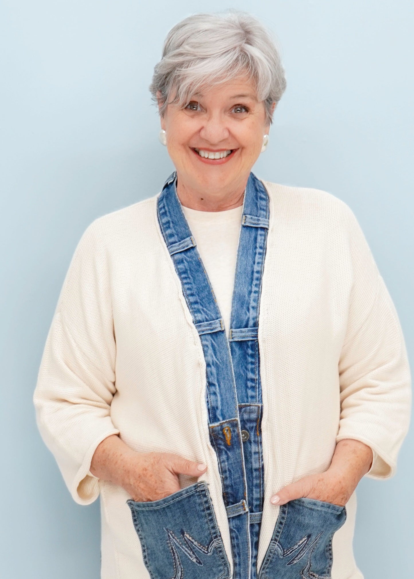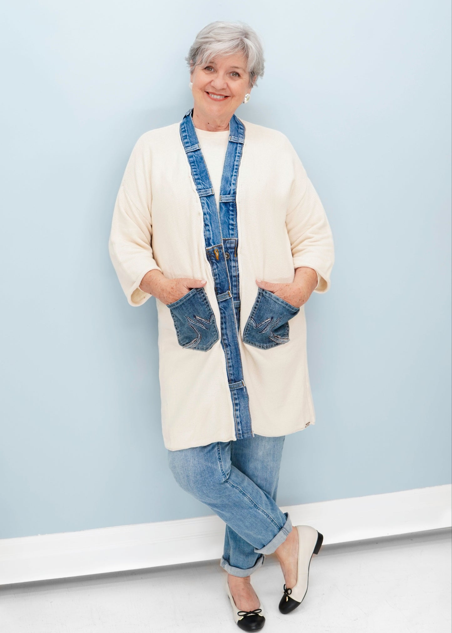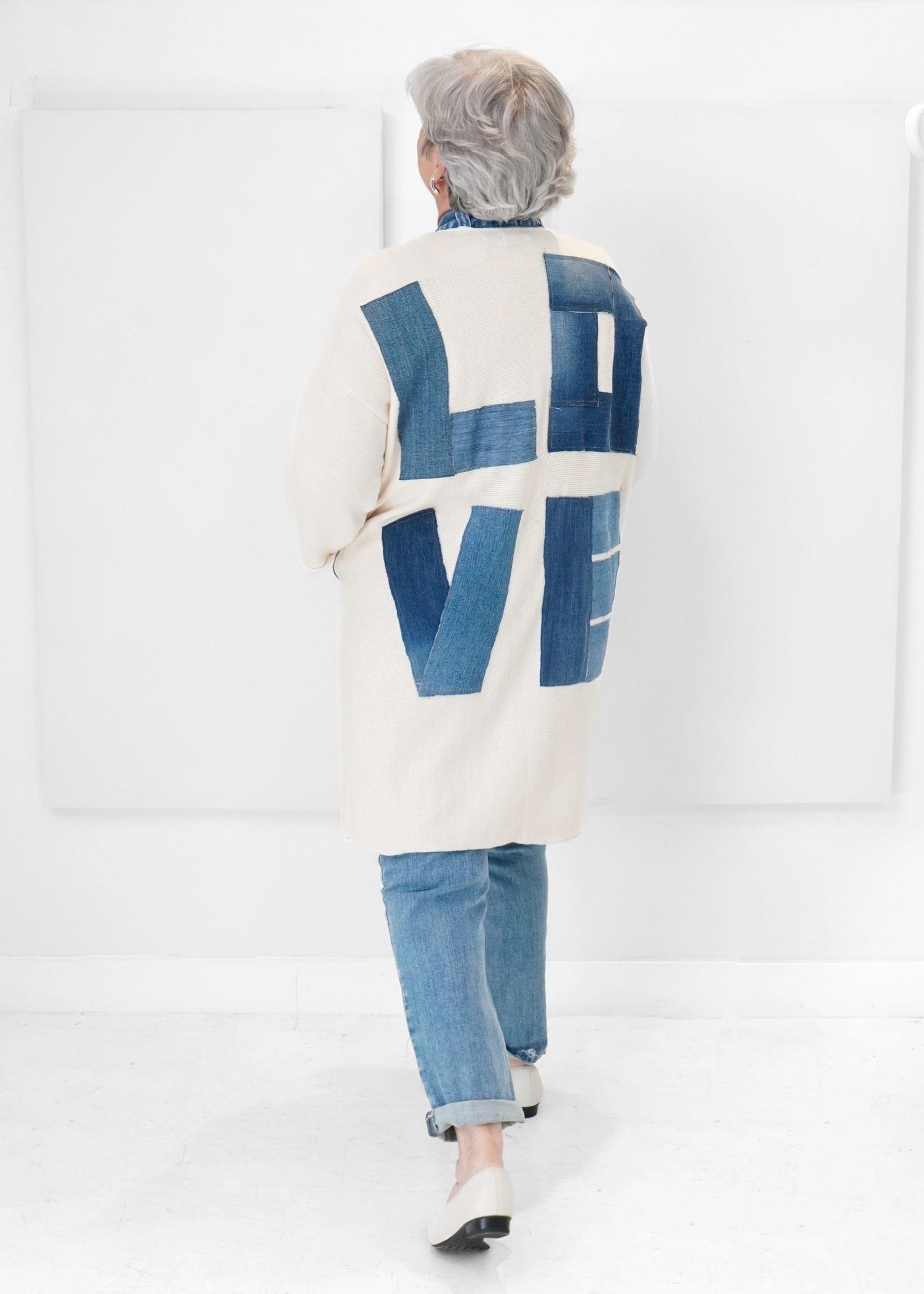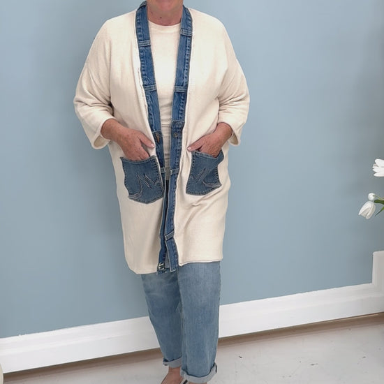 The Shannon Passero Love Cardigan features hand-loomed cotton combined with upcycled T-shirt and denim for a sustainable, textured look. Designed as a versatile one-size piece, it offers effortless style and comfort.