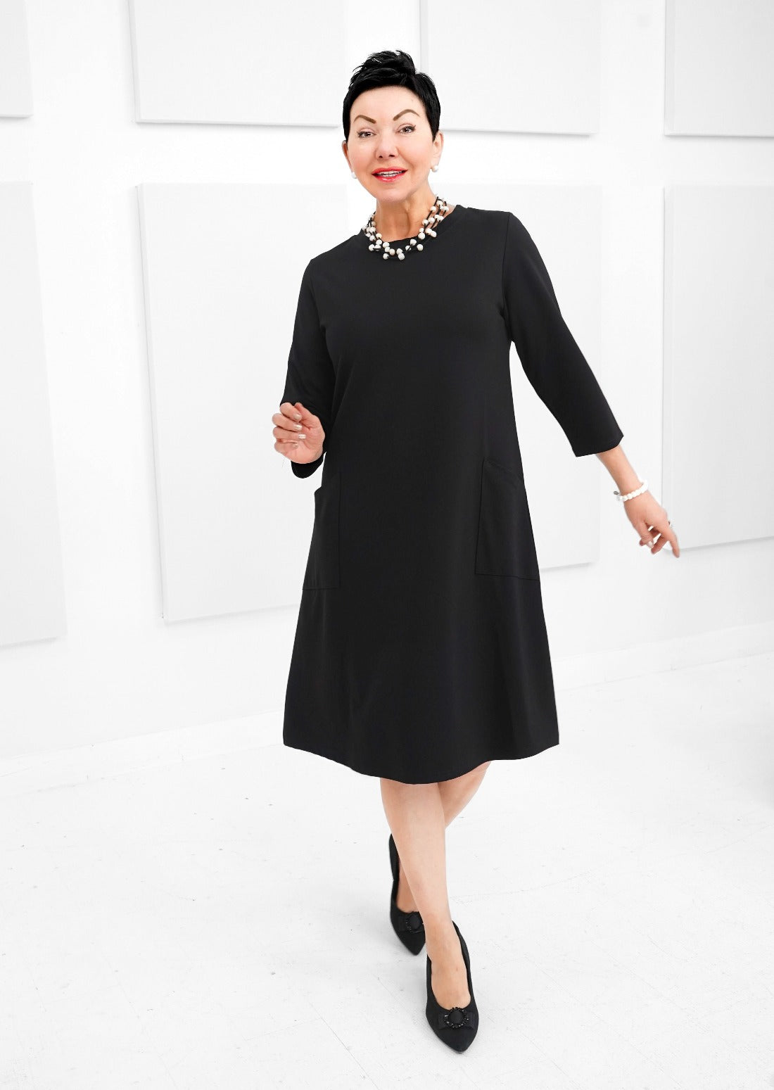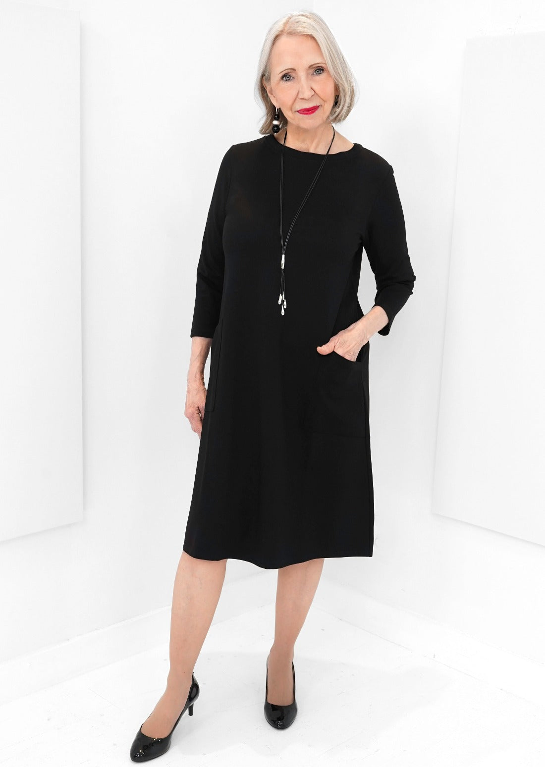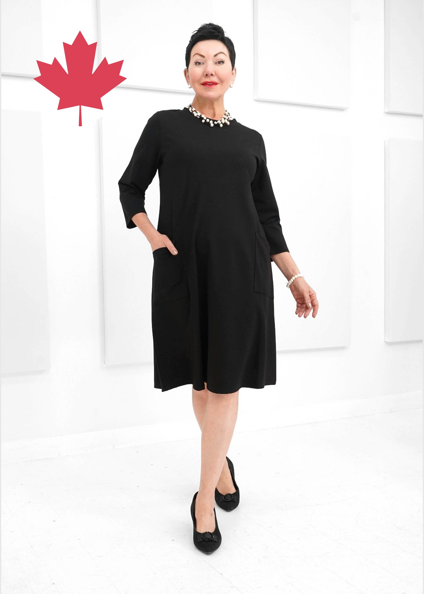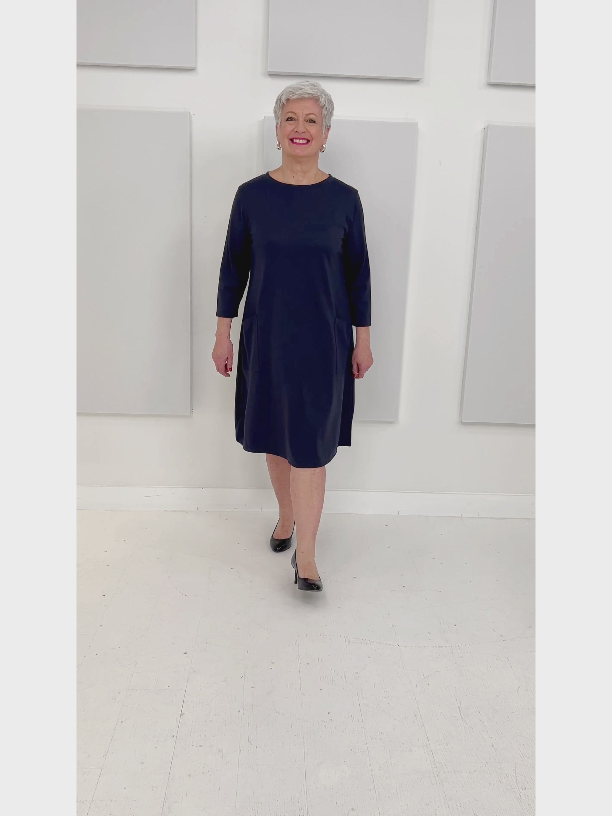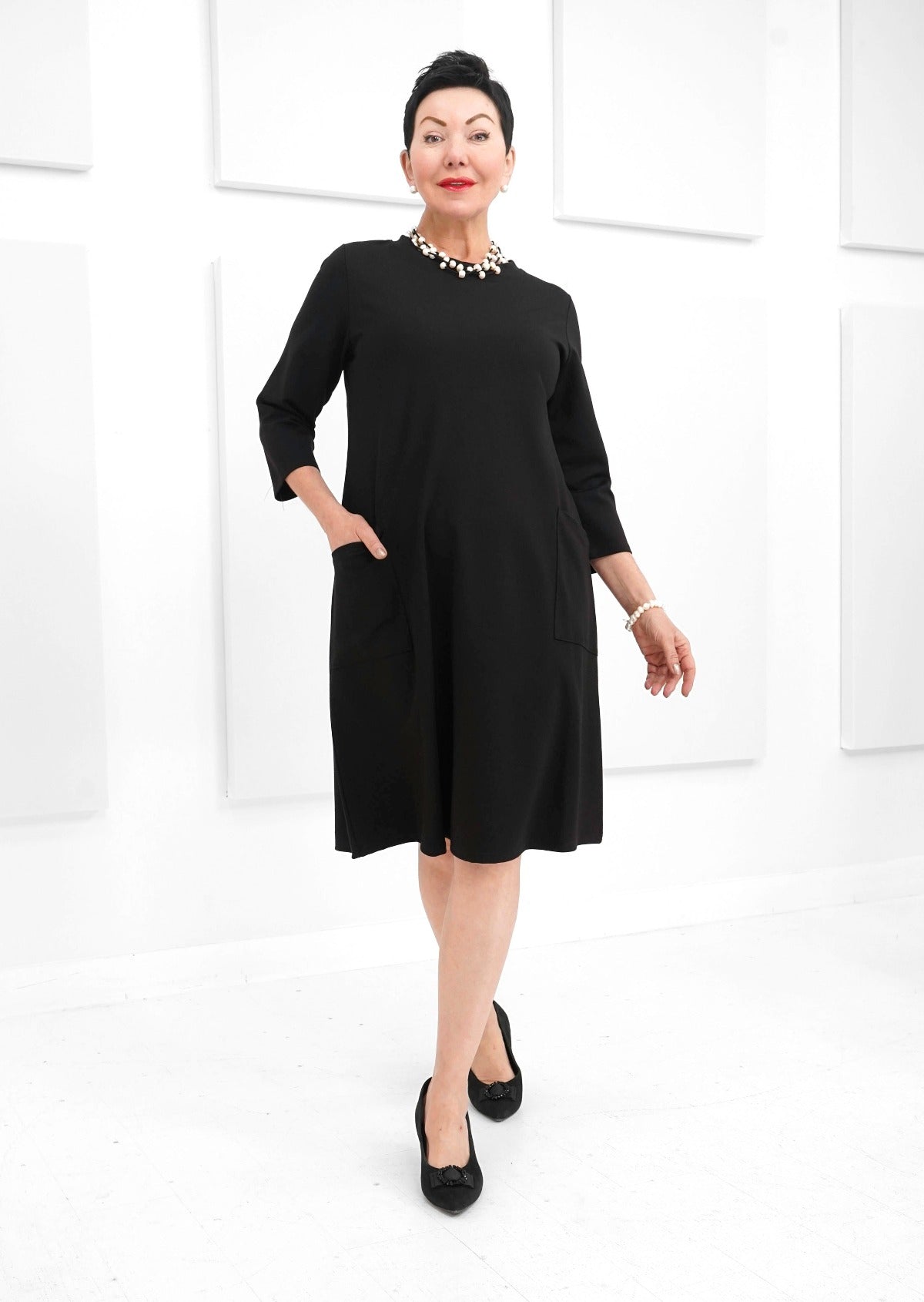 Introducing the Trudy dress, named after the late Mrs. Shepherd. This timeless piece exudes elegance and style. A tribute to a remarkable woman. This dress features ¾ sleeves, comfortable and durable ponte fabric and 2 convenient pockets, the perfect dress for any occasion.