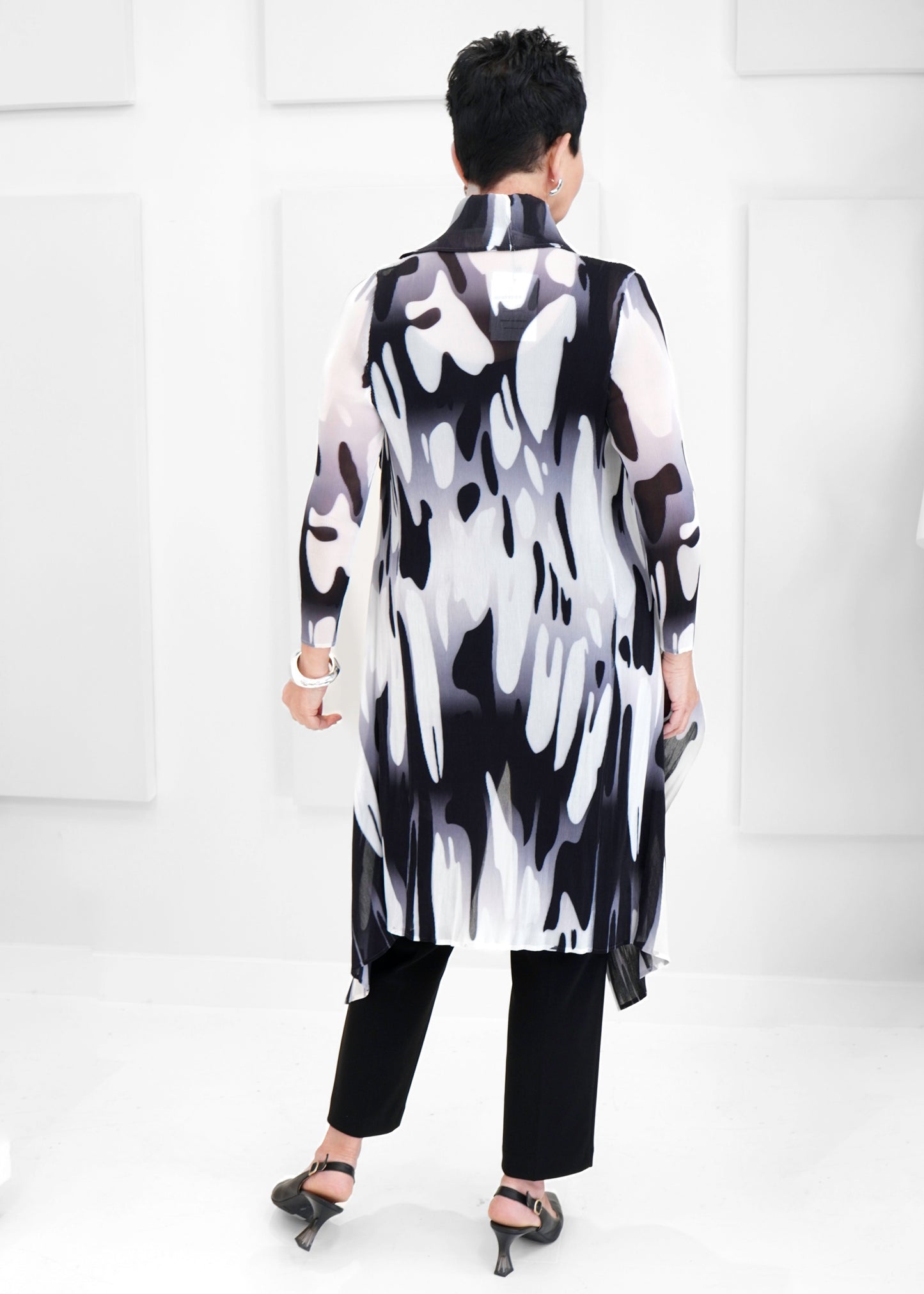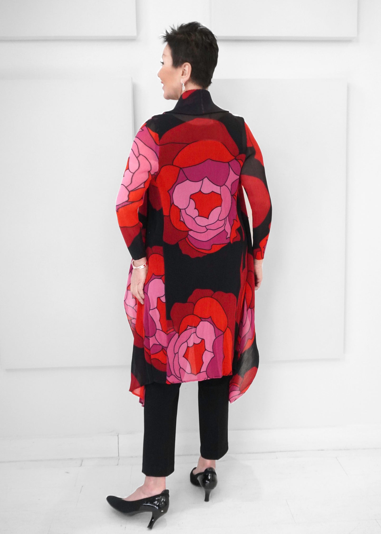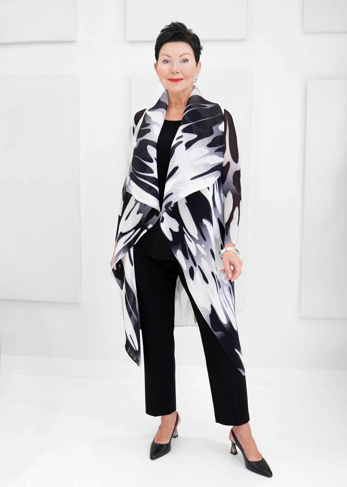 The Collare Coat is reminiscent of a waterfall. The beautiful pleated folds created within the chiffon material make it an easy to wear Alquema piece and is perfectly paired with the Long Estrella Dress.
