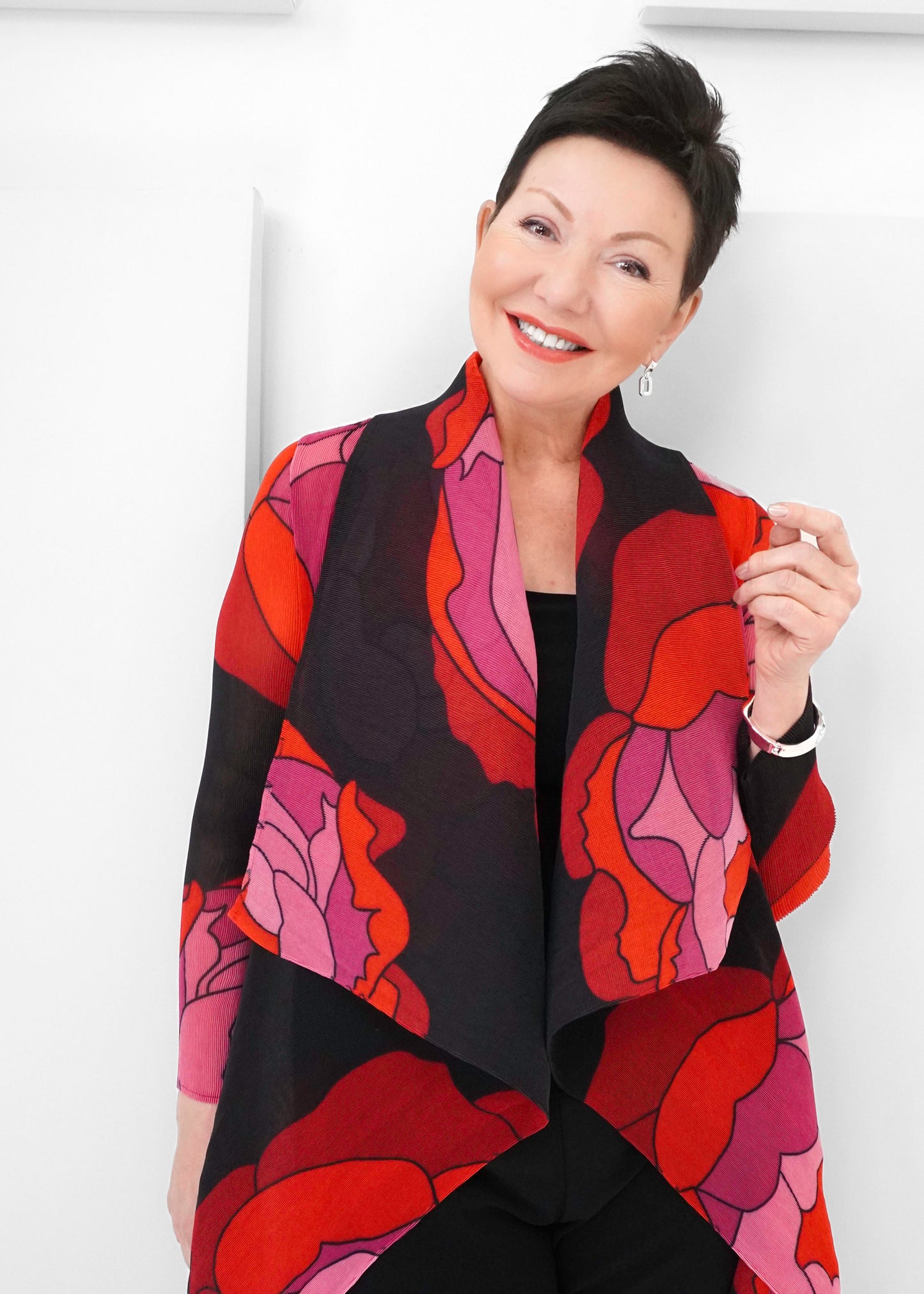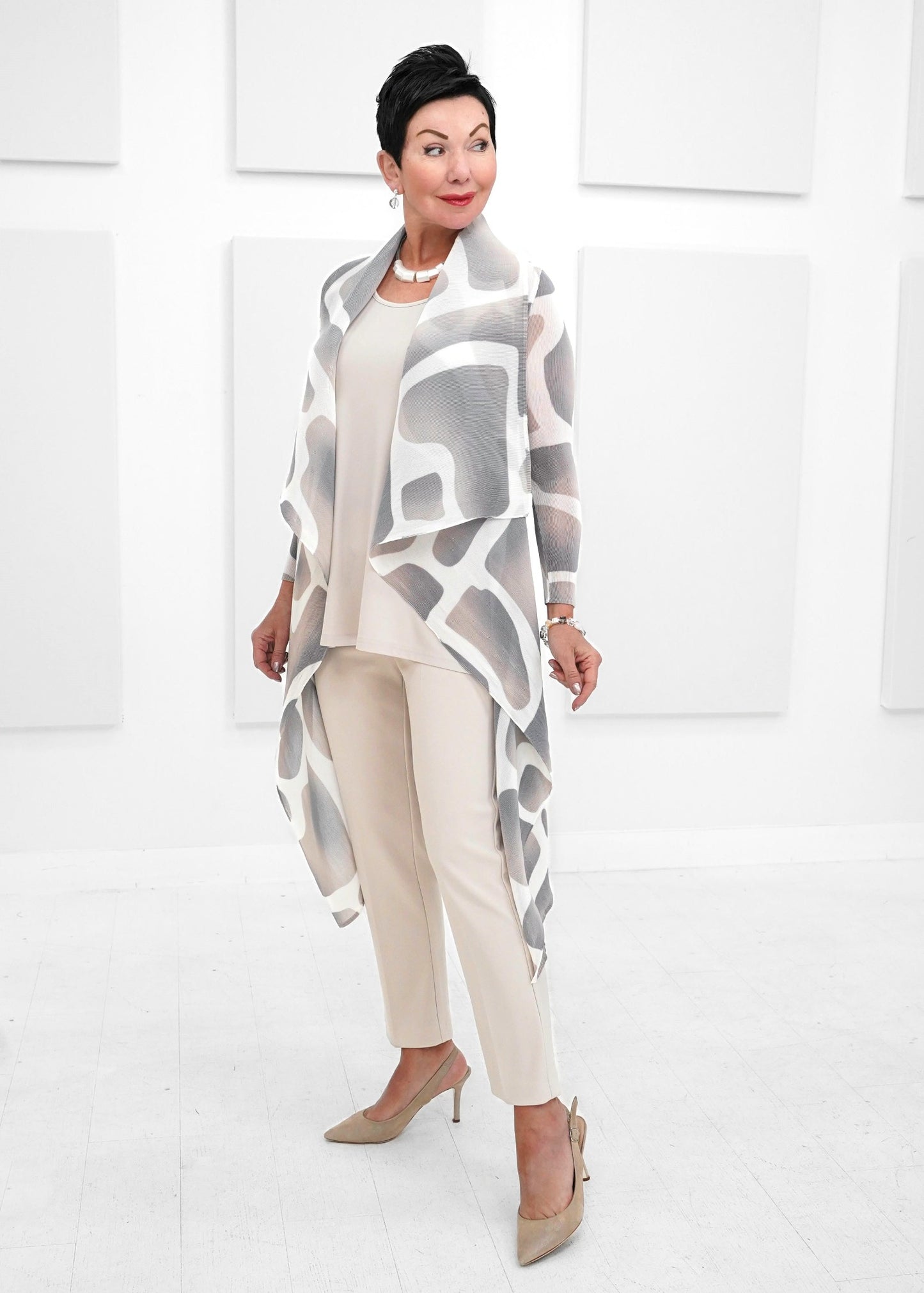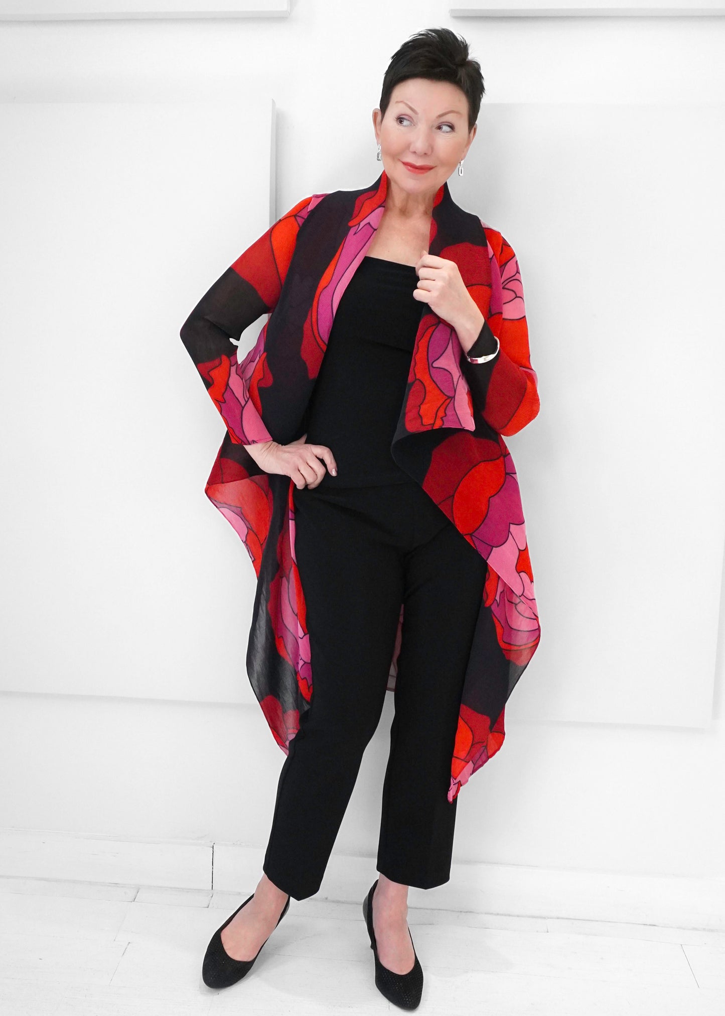 The Collare Coat is reminiscent of a waterfall. The beautiful pleated folds created within the chiffon material make it an easy to wear Alquema piece and is perfectly paired with the Long Estrella Dress.