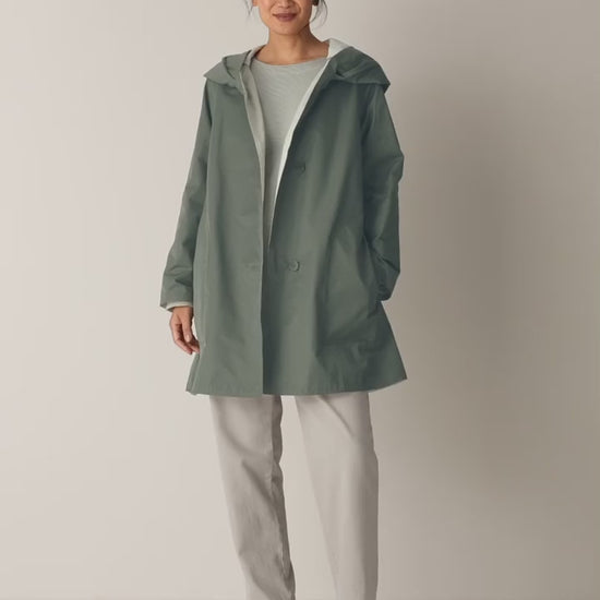 Wear it one day, reverse it the next. A versatile hooded coat with a button front, in a cotton nylon weave with subtle sheen. (Copyright Eileen Fisher 2025)
