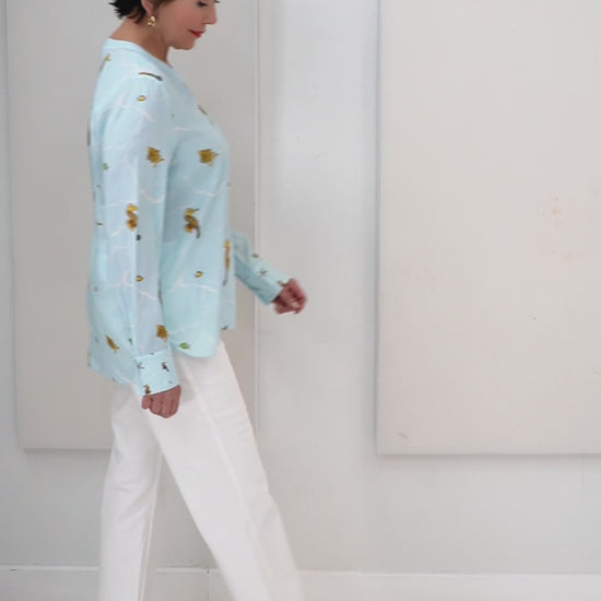 Herzen – Silk Shellfish Seahorse Print Blouse — Crafted in a luxurious silk blend, this blouse features a sophisticated V-neckline and refined button cuffs. The distinctive shellfish and seahorse print make a modern statement, while the clean, elegant silhouette exudes effortless luxury and refined style.