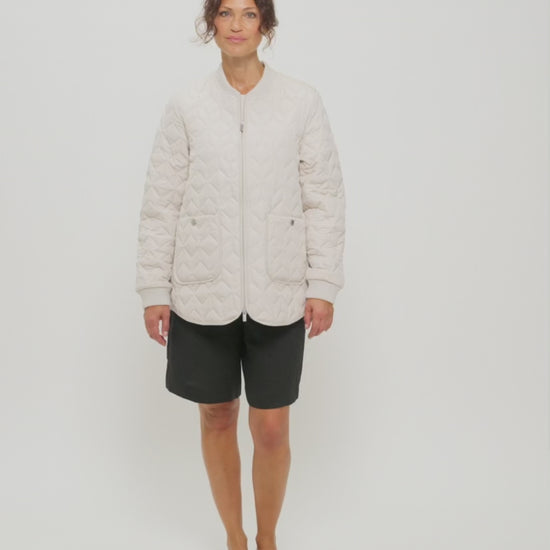 This quilted jacket features a soft lining and a distinctive quilted pattern. Ribbed details at the neck, cuffs, and a slightly longer hem ensure a comfortable fit. Carefully designed, this jacket features a two-way YKK zipper with a logo, front pockets, and an inside pocket with a hook-and-loop closure. Ideal for transitional seasons, it can be worn alone or layered under a raincoat. (Copyright Ilse Jacobsen 2026)