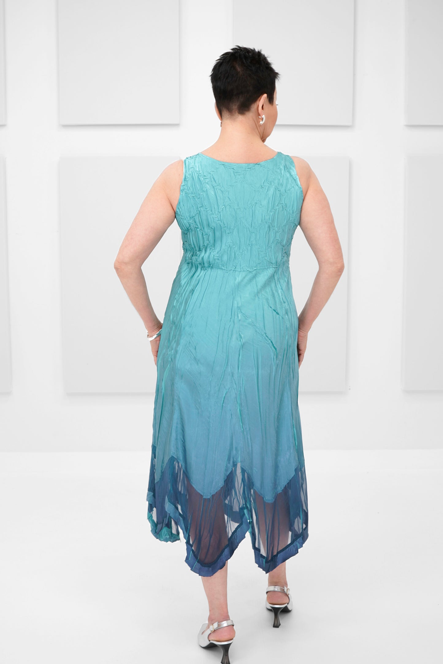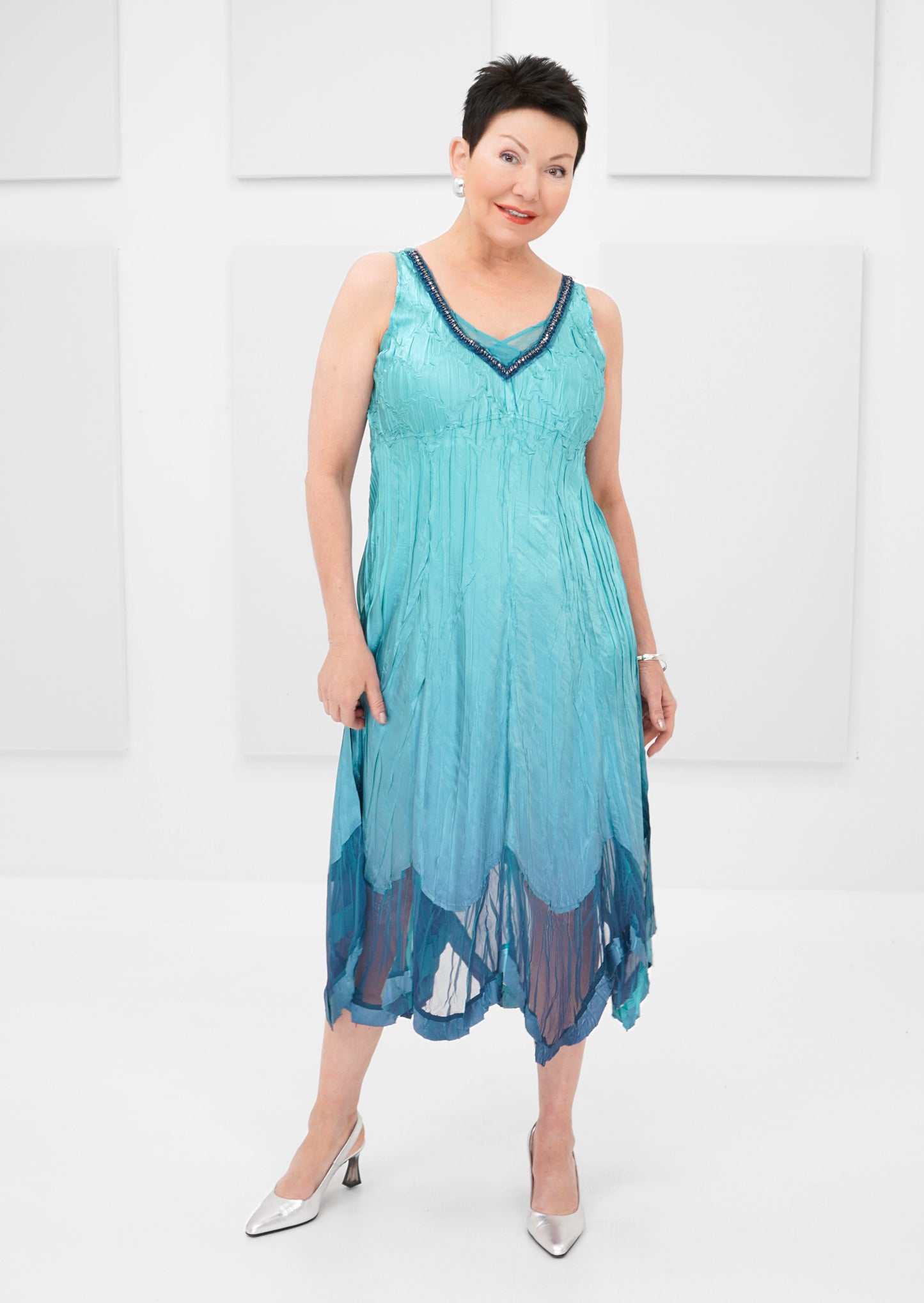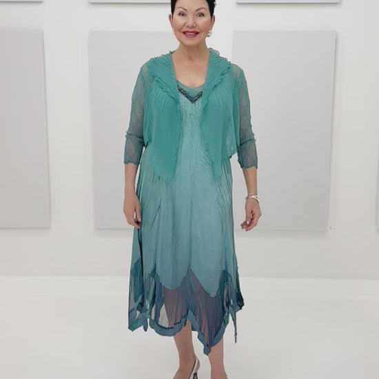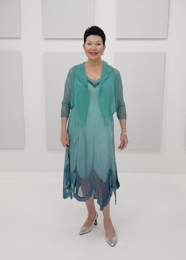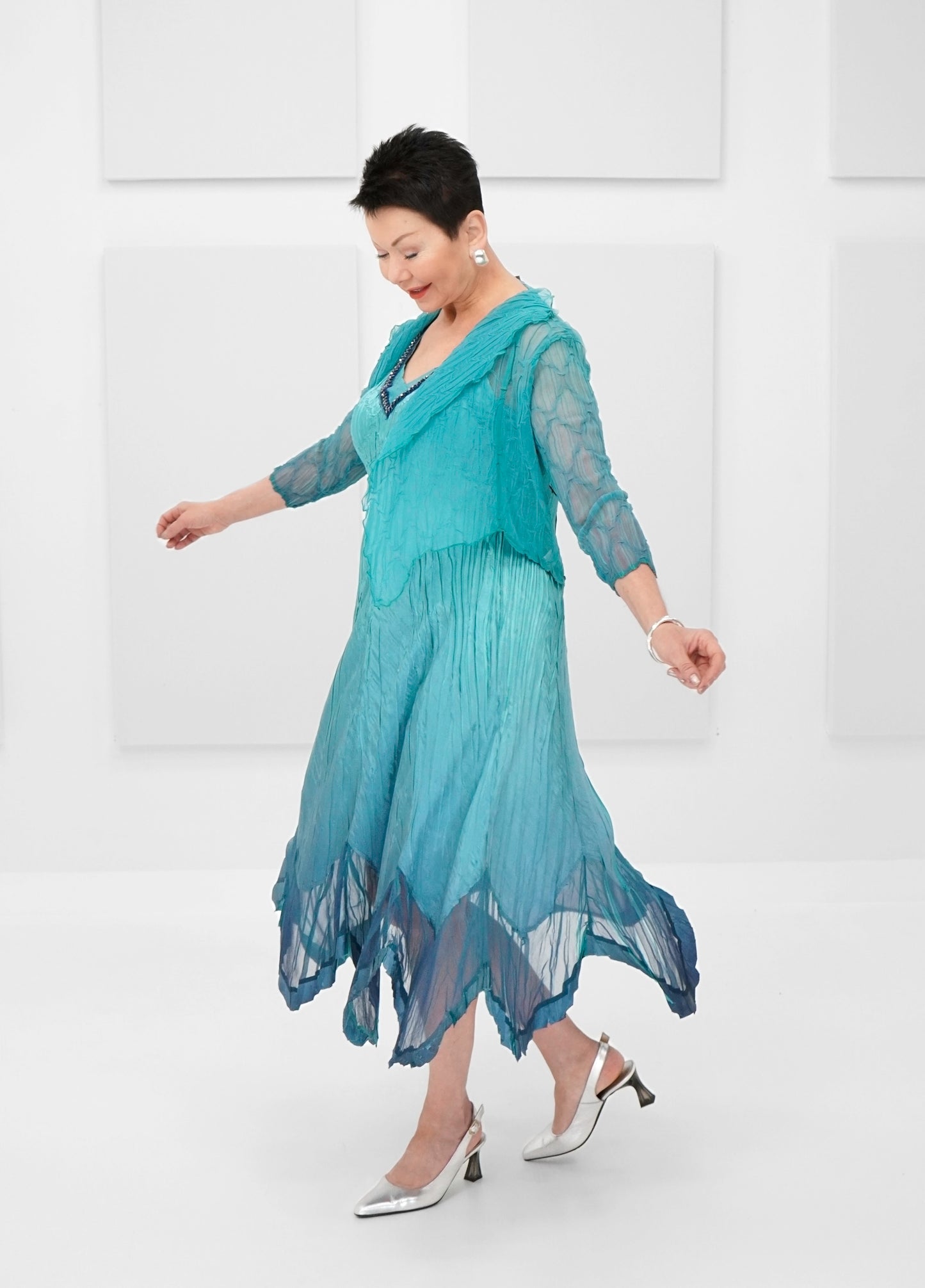 The Komarov Ombre Two-Piece Dress and Jacket effortlessly blends elegance with modern sophistication. The sleeveless V-neck dress is adorned with jewel accents and crafted from crinkled, pleated satin charmeuse, finished with a scalloped hem that adds fluidity and movement. Its midi-length A-line silhouette flatters the figure with timeless grace. The matching crinkled chiffon bolero jacket, with its 3/4 length sleeves, completes this ensemble with a touch of refined luxury, making it the perfect choice for any special occasion.
