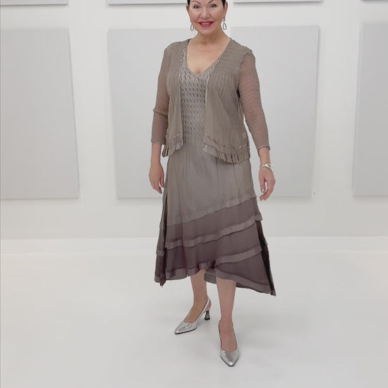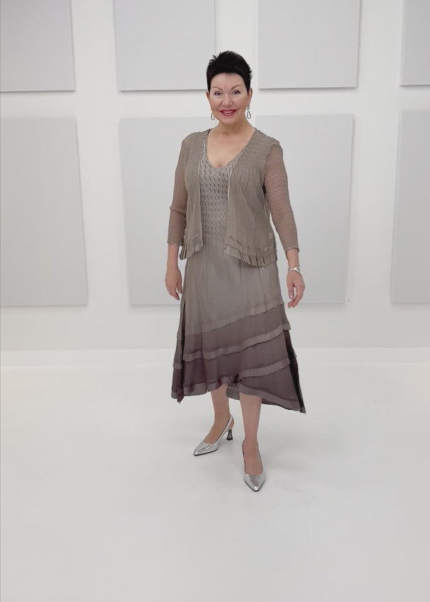 The Komarov Two-piece Dress and Jacket Set radiates timeless sophistication and elegance, seamlessly blending refined style with effortless grace. The pleated V-neck dress features a sleeveless design and an asymmetrical chiffon hem, offering a flattering A-line silhouette that beautifully enhances every figure. The coordinating chiffon bolero jacket, with its 3/4 length sleeves and opulent satin trim, adds a touch of luxury and the perfect finishing detail, elevating this ensemble to an extraordinary level of beauty and class.