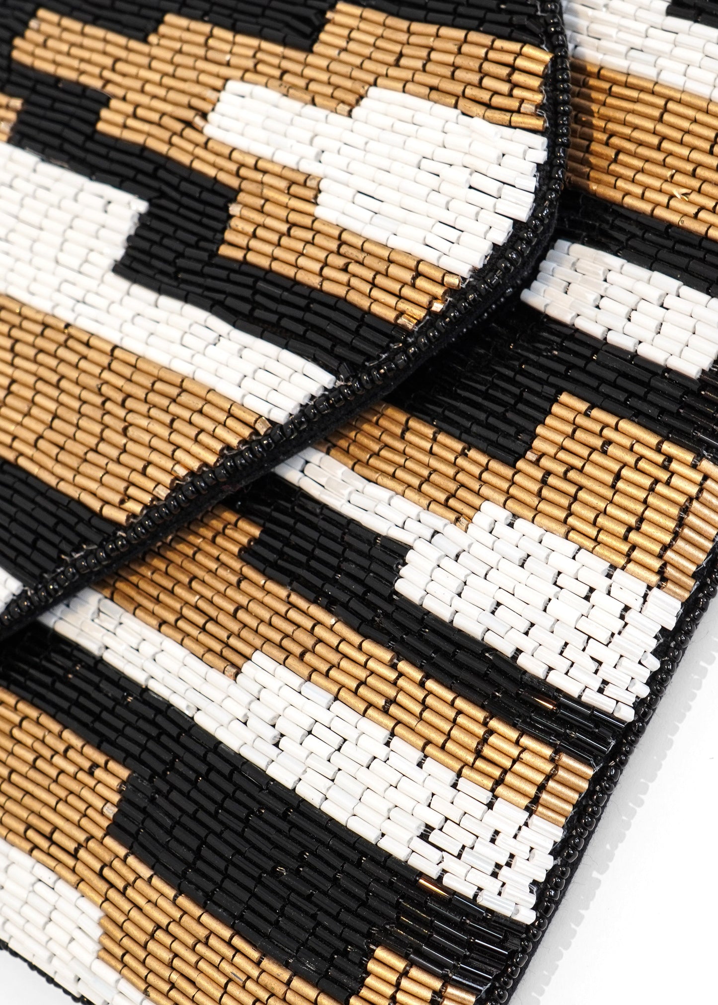 Elevate any outfit with our LCD Black & Gold Beaded Clutch Bag, featuring a stunning combination of intricate black and gold beading. Its versatile design allows you to carry it as a sleek clutch or wear it with the included chain strap for a hands-free, sophisticated option. The detailed beading adds a touch of elegance and opulence, making it a true statement piece. A perfect fusion of luxury and style.