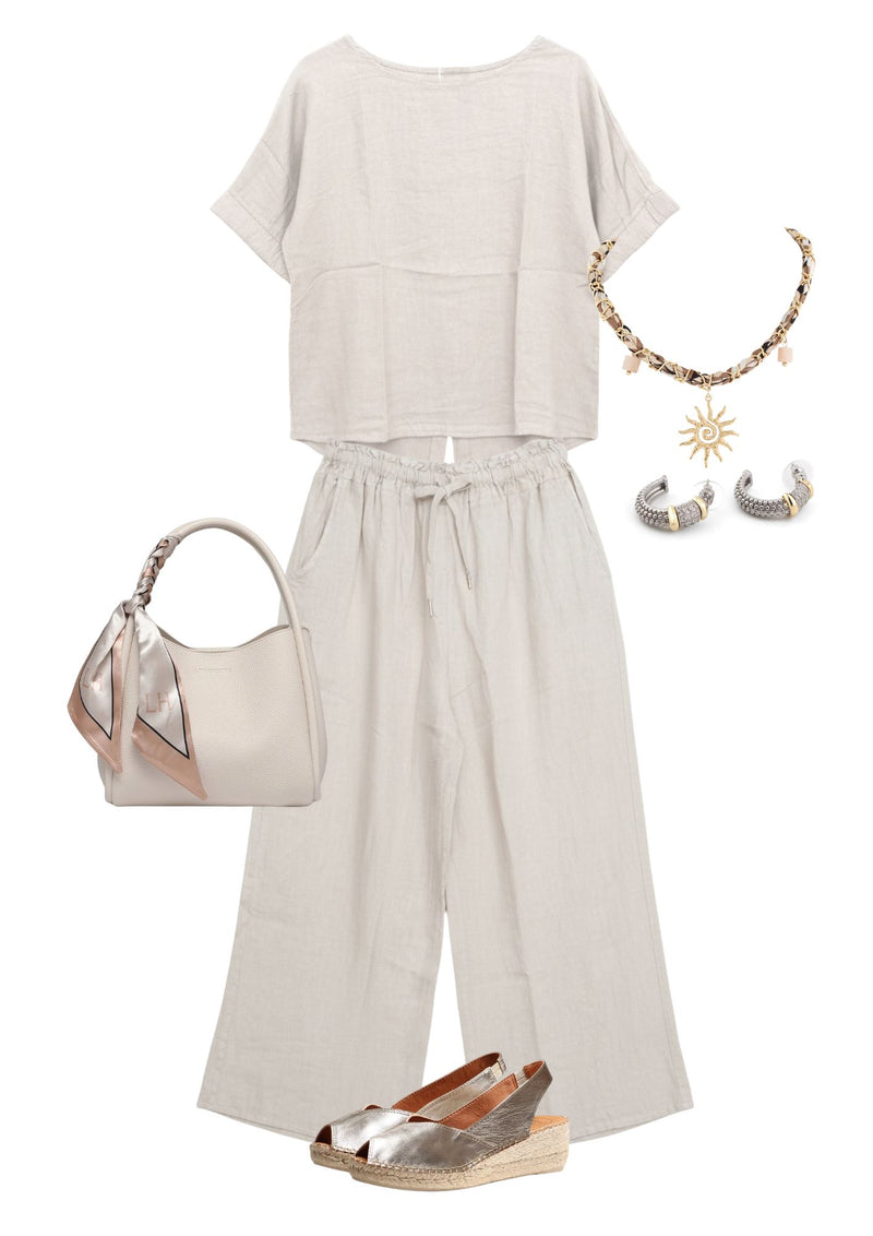 Chic and comfortable, Maeve’s Elastic Top features short sleeves with elasticized cuffs for a gentle, gathered effect, and a button closure at the back for an elegant finishing touch. Its relaxed yet polished silhouette makes it perfect for casual outings or layered looks with a refined, effortless style. (Copyright Orange 2025)