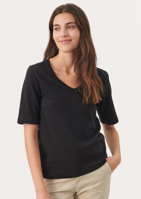 Introducing your new go-to essential - Part Two's Ratansa V-neck Top. Made from ultra soft 100% organic cotton, this basic everyday t-shirt is versatile and easy to wear. Upgrade your wardrobe with comfort and sustainability in mind.