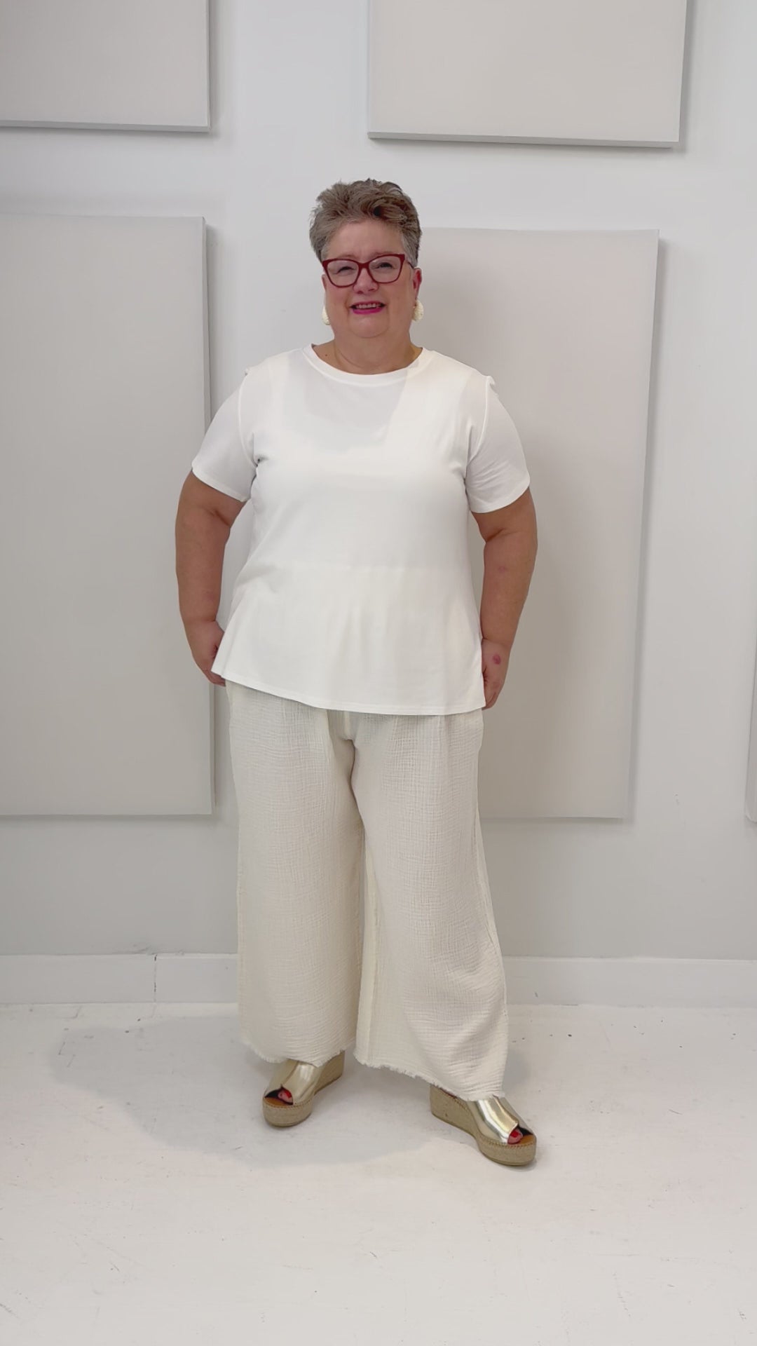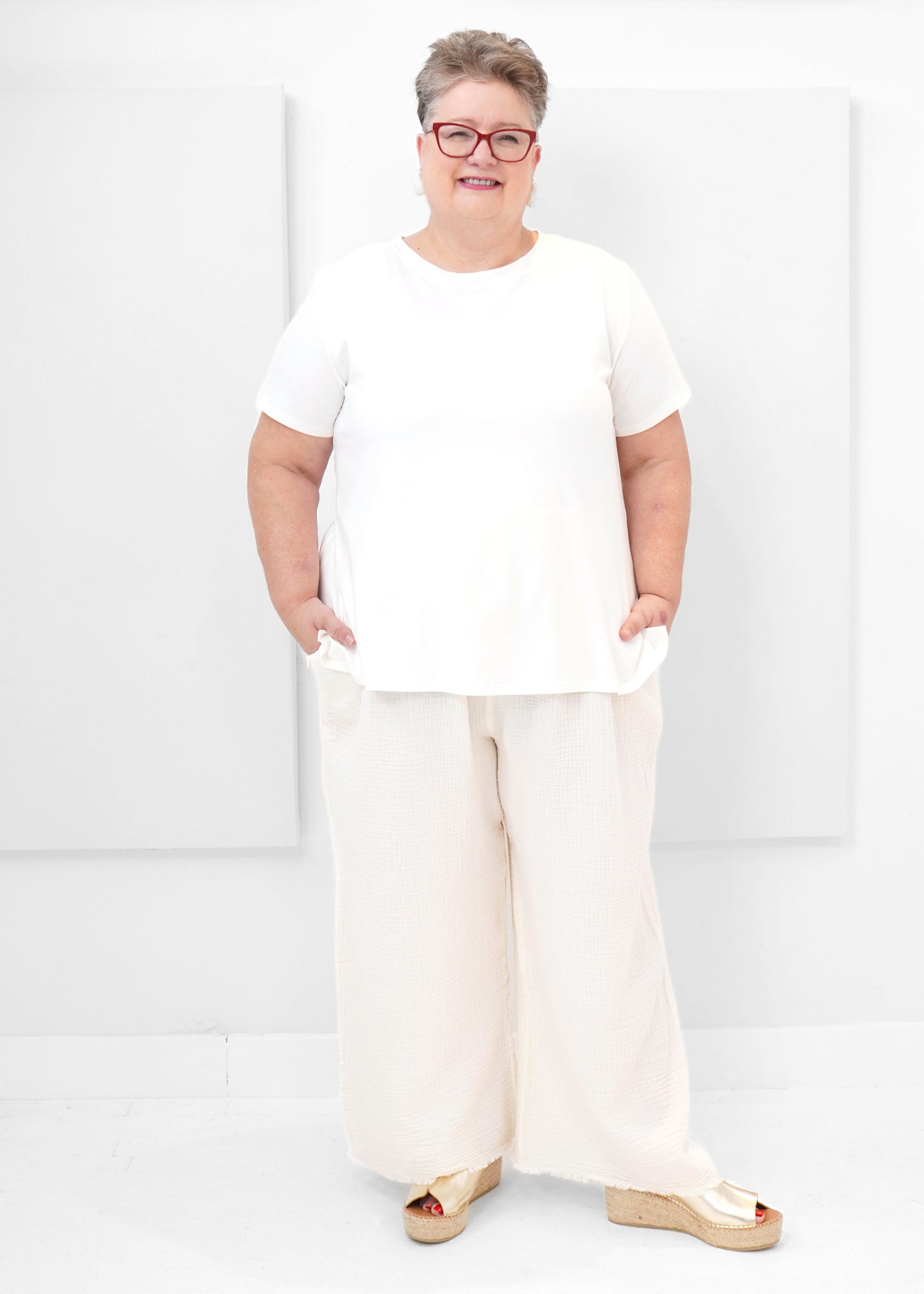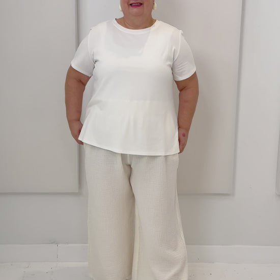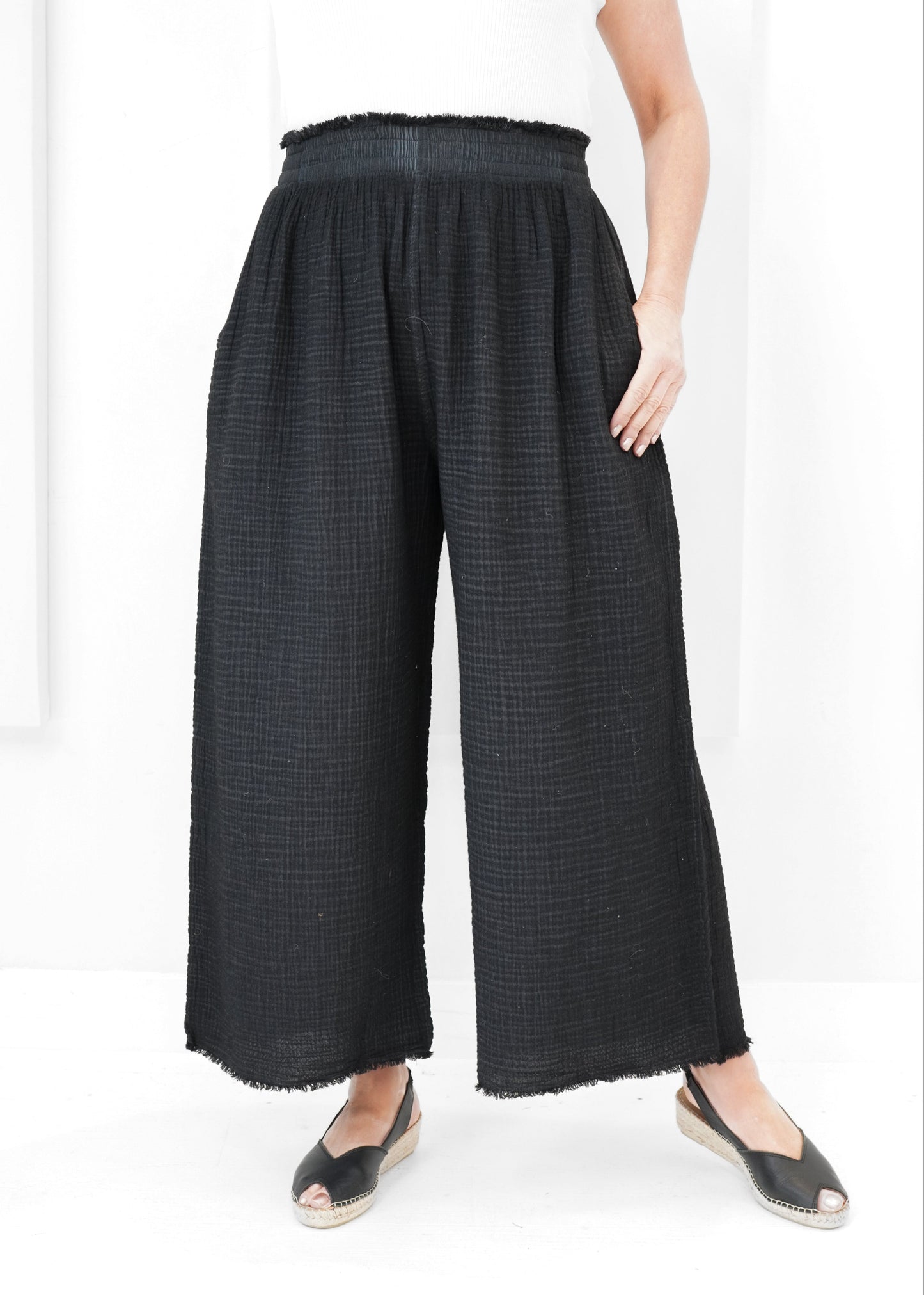 The Palazzo Pants Plus includes a wider waistband, more generous room in the thighs, and an interior drawstring to help secure the pants as needed when worn. Made with Turkish muslin cotton, these pieces are gentle and sensory friendly on the skin. Their low-maintenance, lightweight crinkle texture makes them perfect for warm-getaways, or as cozy loungewear - an everyday, every-situation wardrobe essential. (Copyright Pokoloko 2025)