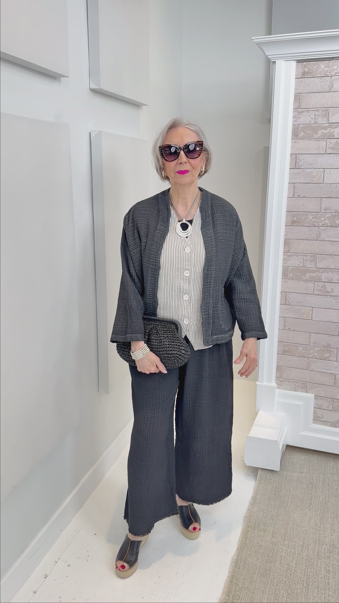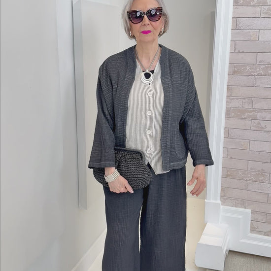 When it's too warm for a sweater but you need an extra layer, the Crinkle Short Jacket features an elegant open cut and boxy fit, complementing any outfit from work to lounge with a touch of eco-luxury. The clean lines and neutral tones of this piece beautifully embody contemporary sophistication and sustainable style. Made with a luxe fabric composed of doubled Turkish muslin cotton, this Jacket feels incredibly soft on the skin, and lightweight yet substantial when worn. (Copyright Pokoloko 2025)