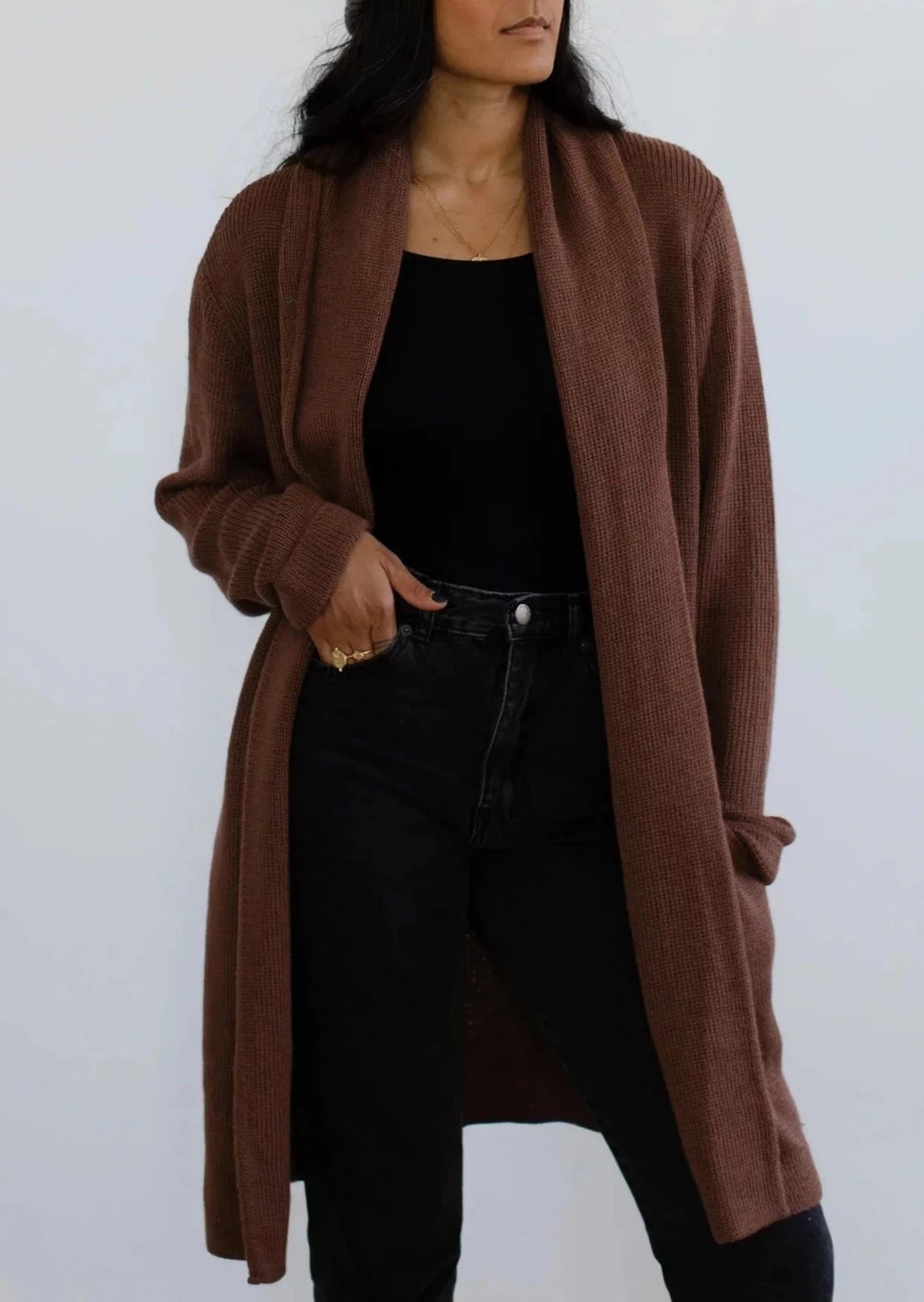With deep open pockets and rounded shoulders, the Mia Sweater has a versatile style infused with the Peruvian textile artistry. Alpaca has a stretchy, silky nature to it, so this one-size alpaca style is able to fit many different types of bodies. We’ve gone a medium length, with a complementary backline; this doubles as a Fall, transition coat, and a year-round sweater.