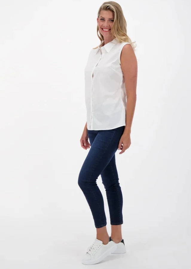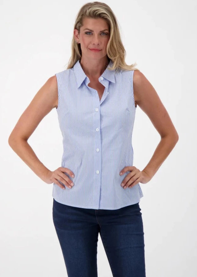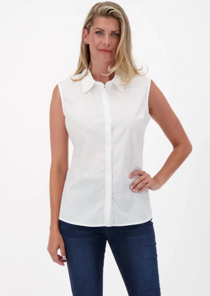 Our semi-fitted wrinkle-free stretch poplin Spanner Sleeveless Shirt is a wardrobe essential that can be worn as a standalone piece or layered with other garments.