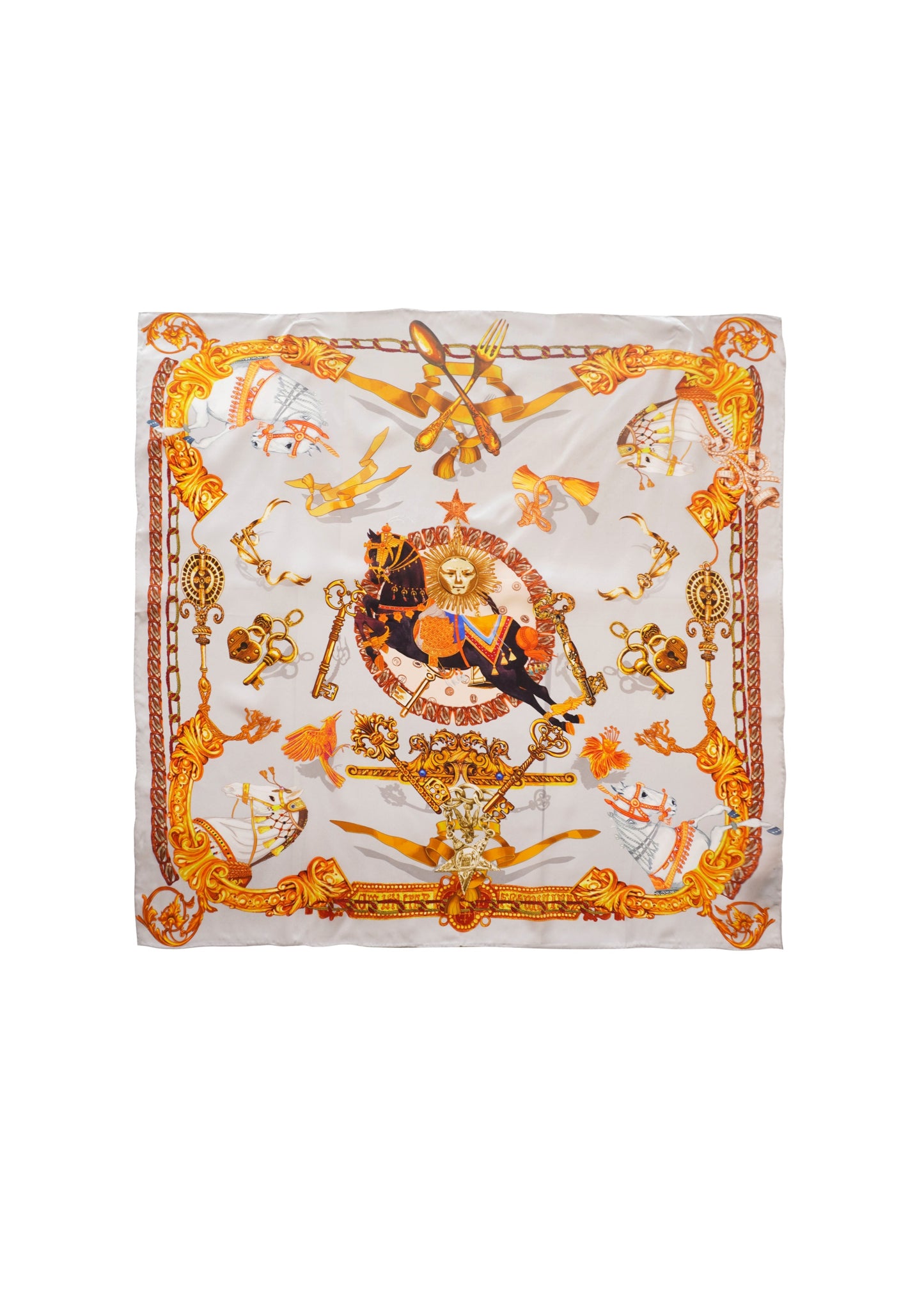 Unlock the secret to effortless style with Tom & Eva's Lock and Key Silk Scarf. Featuring luxurious silk and elegant gold accents, this scarf adds a touch of sophistication to any outfit. Perfect for any occasion, complete your look with this versatile accessory.