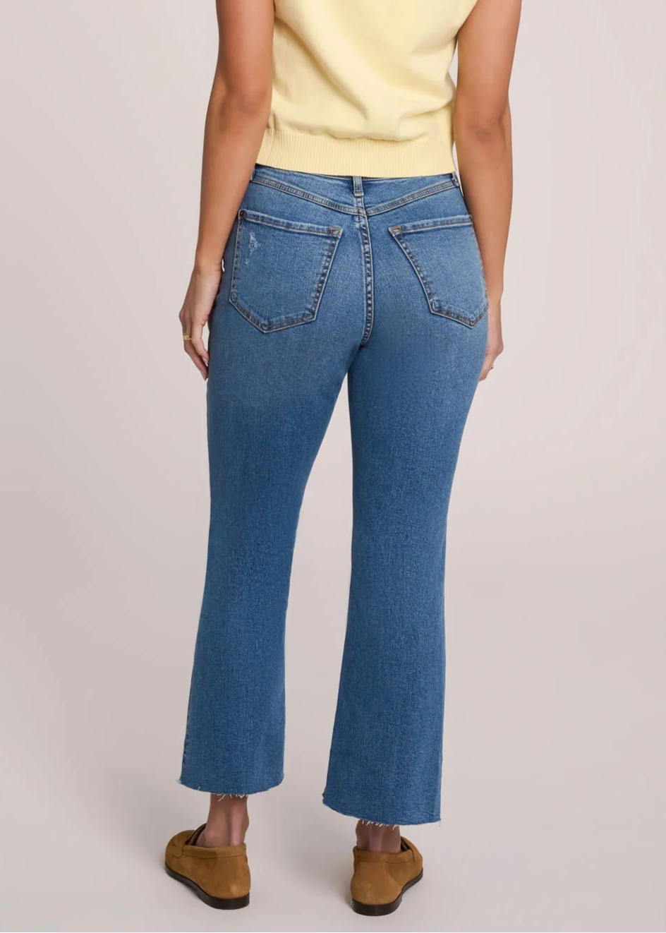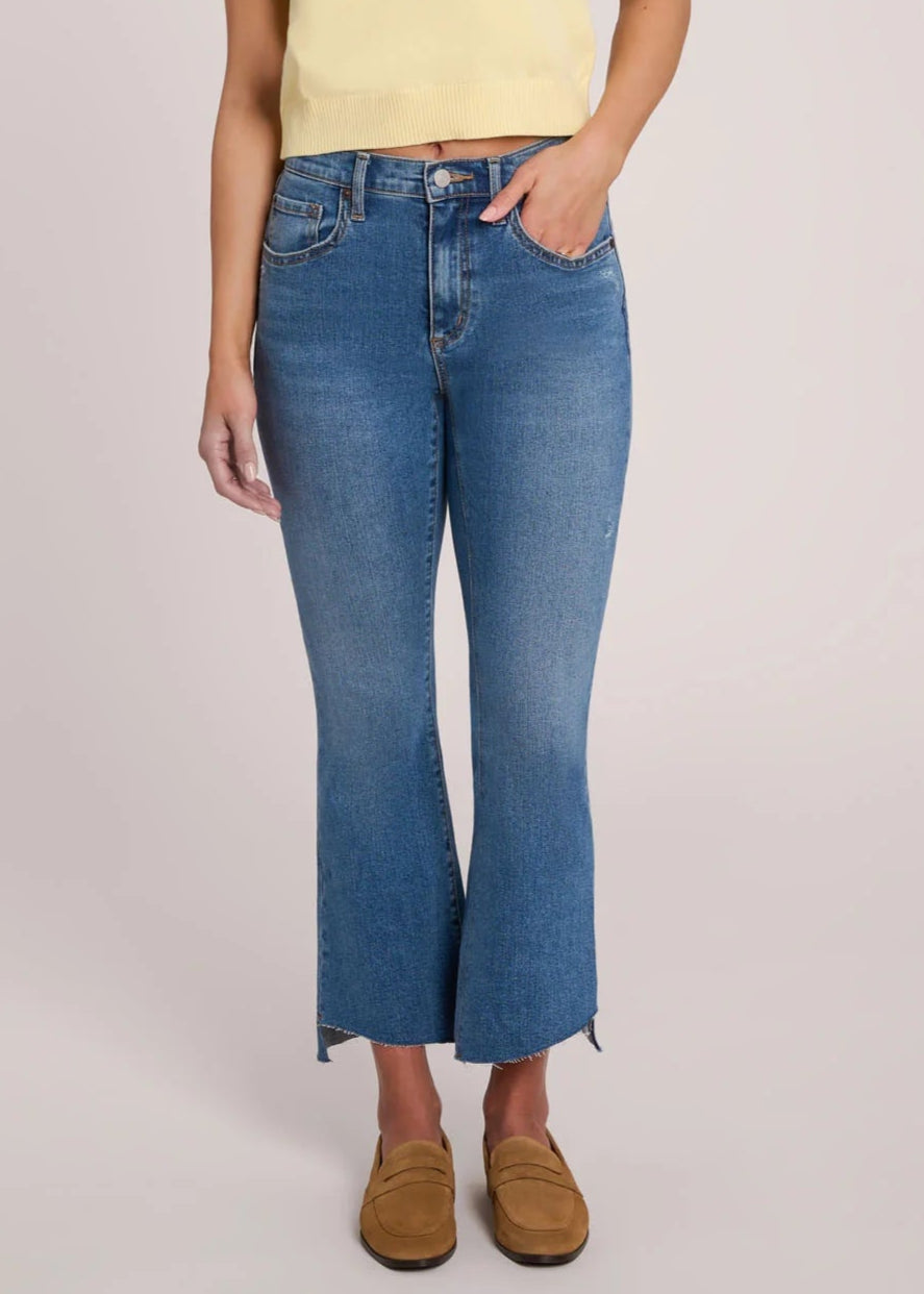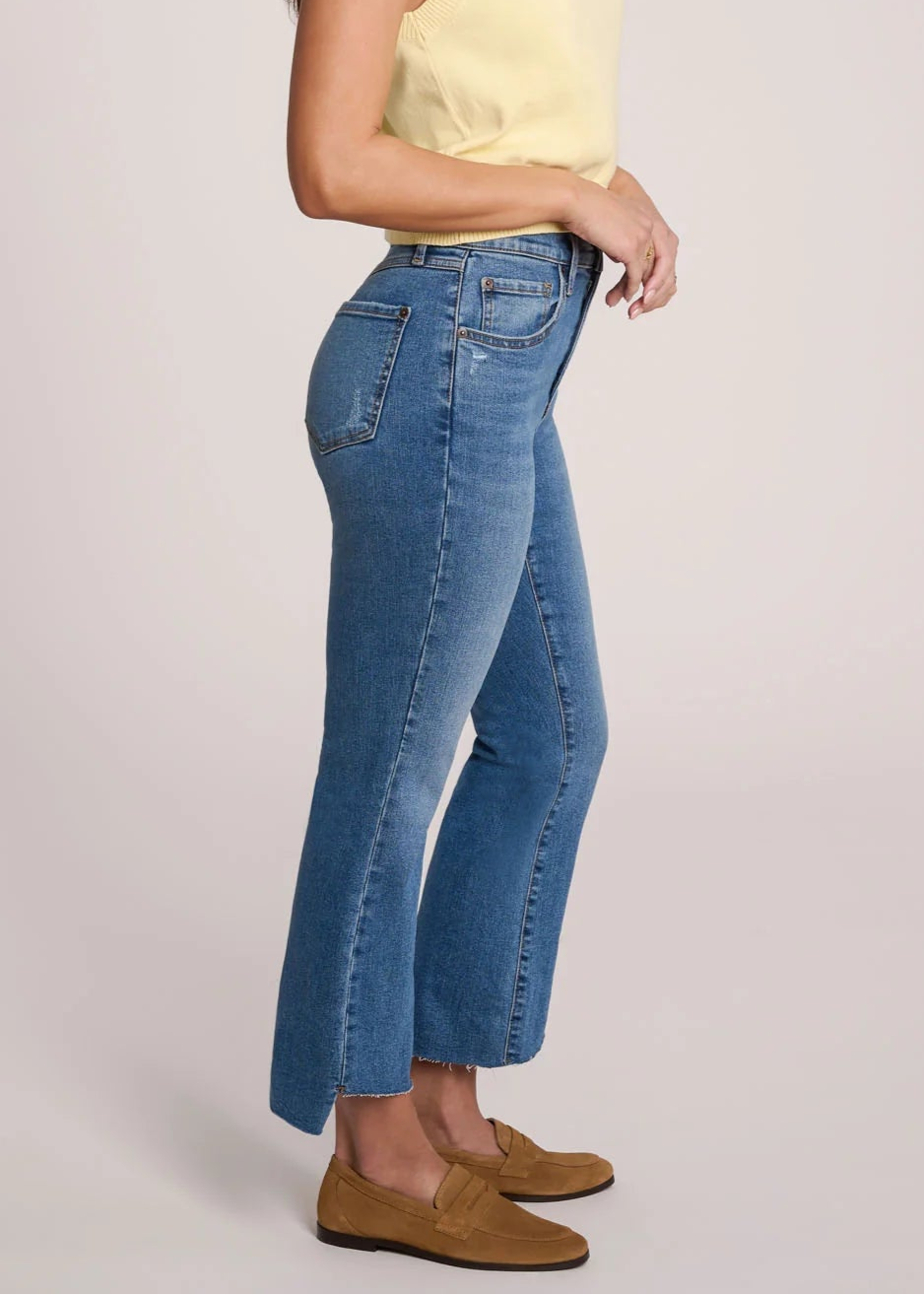 Redefine bootcut with our unique diagonal raw hem and subtle distressed details. Designed to flatter smaller frames, these jeans hug your hips and thighs before releasing at the knee, striking the perfect balance between straight and wide-leg styles. (Copyright Yoga Jeans 2025)